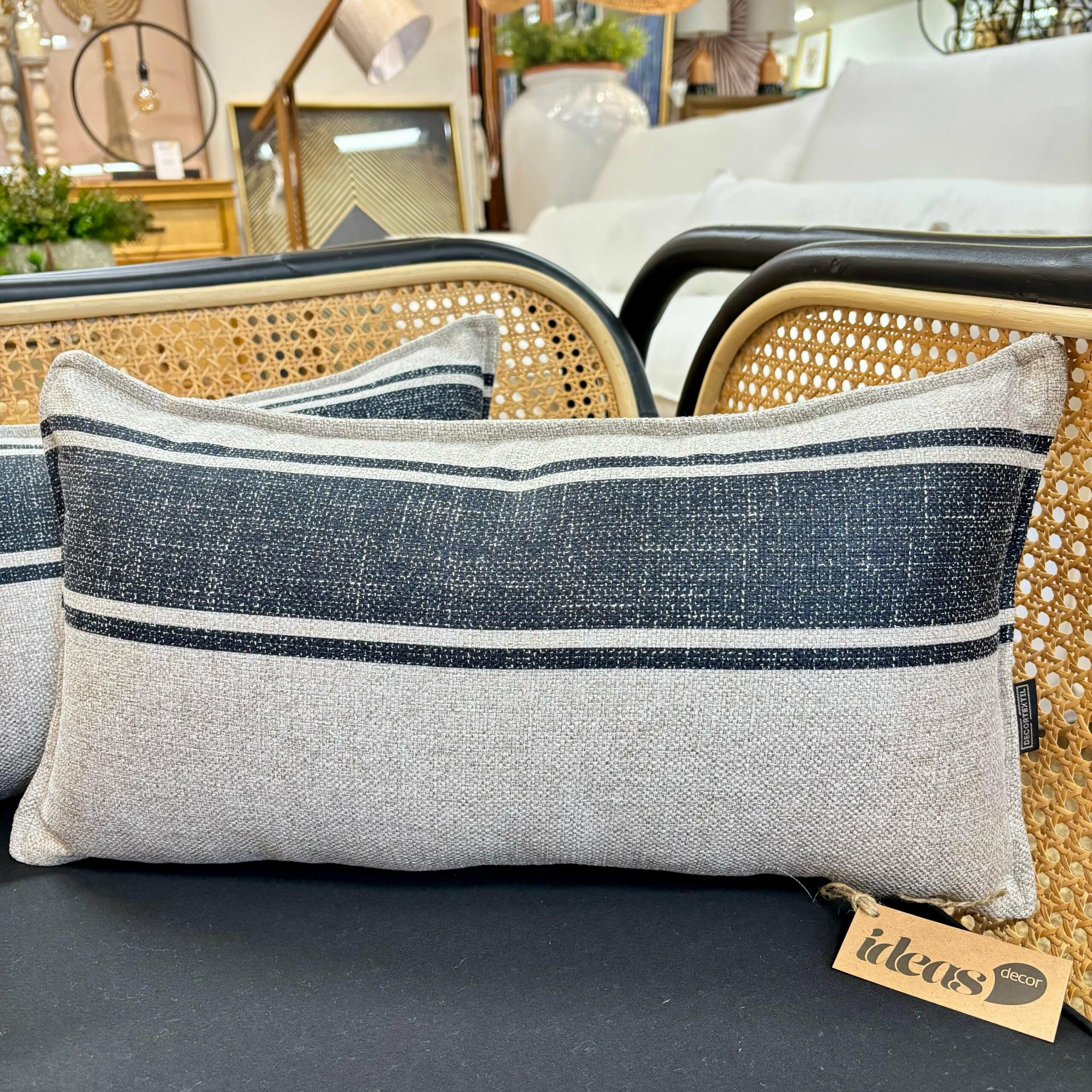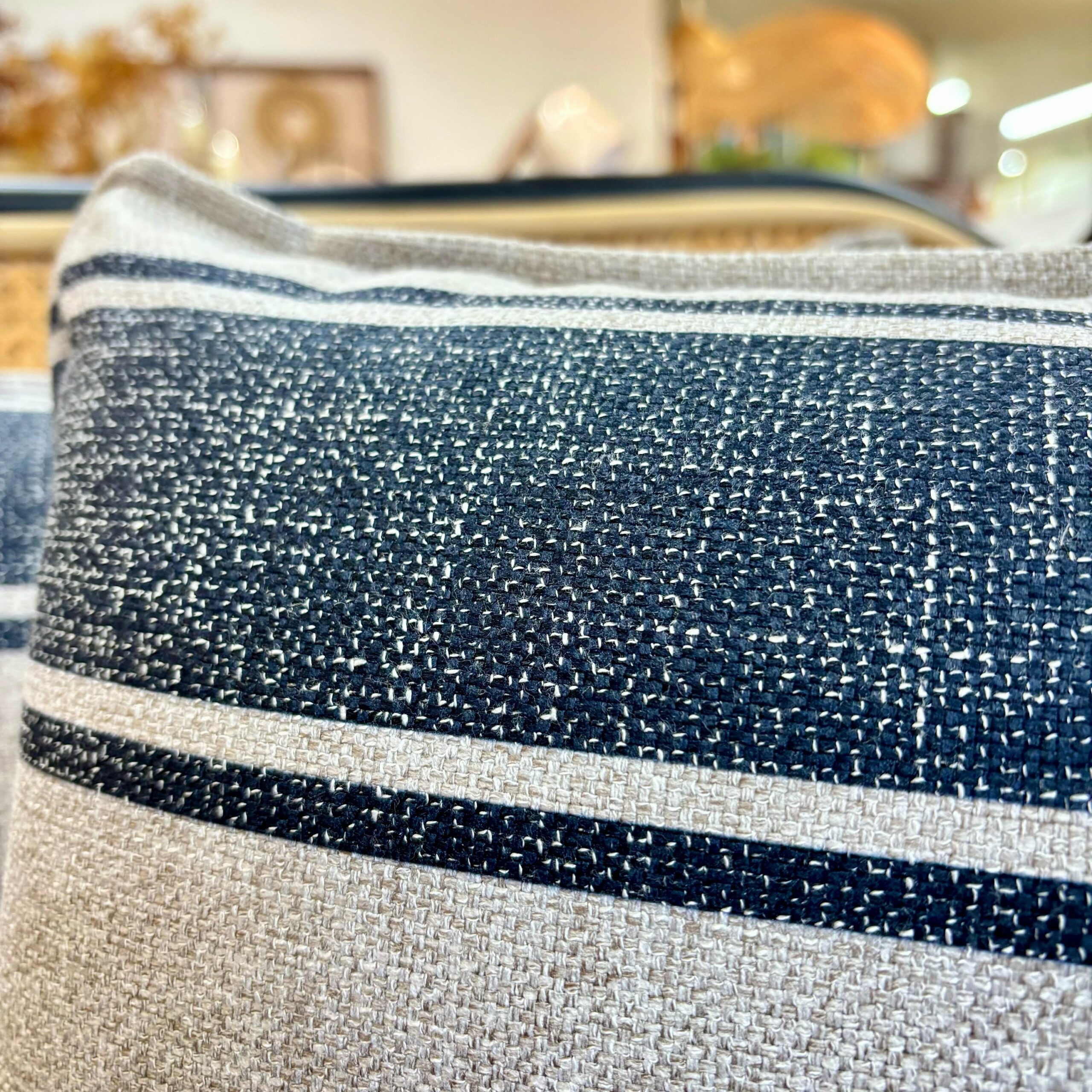 Almofada Baguete em Tecido Rústico com Listras Azul Marinho – Fino Acabamento