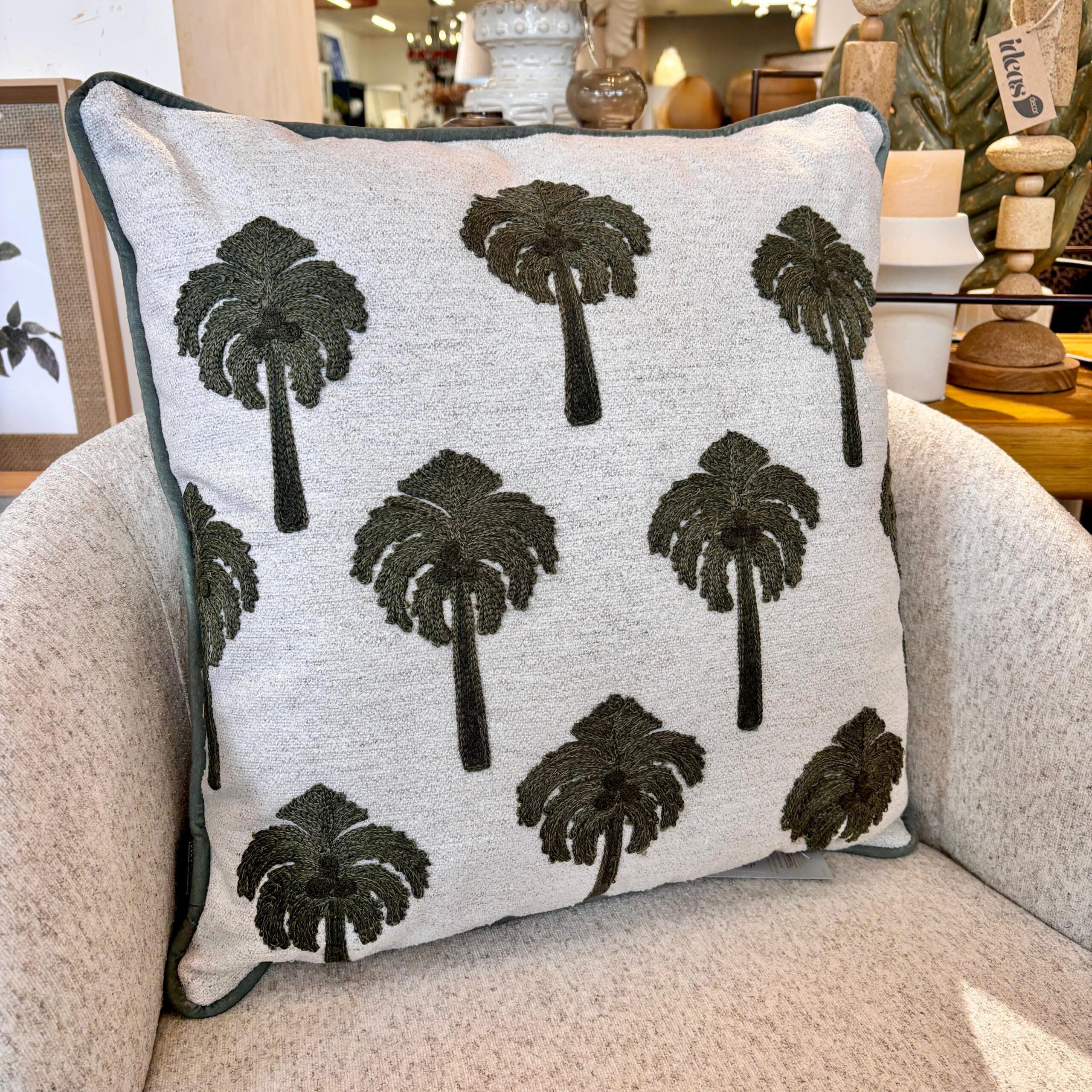 Almofada em Linho Bordado – Coqueiros (52×52 cm) com Enchimento Textura nobre e bordado autoral que trazem o clima tropical chic para o décor. Confeccionada em linho bordado com fino acabamento artesanal, esta almofada em verde predominante é versátil e elegante para sofá, poltrona ou cama.