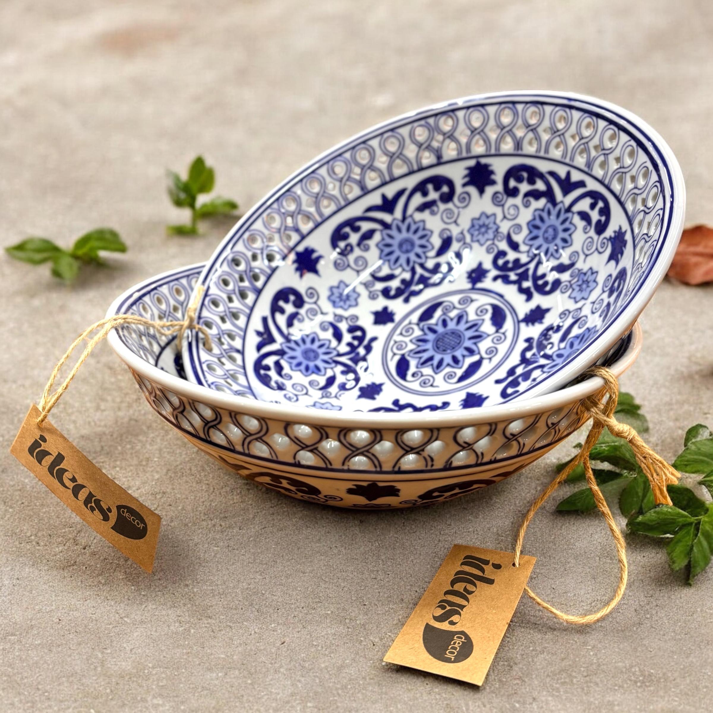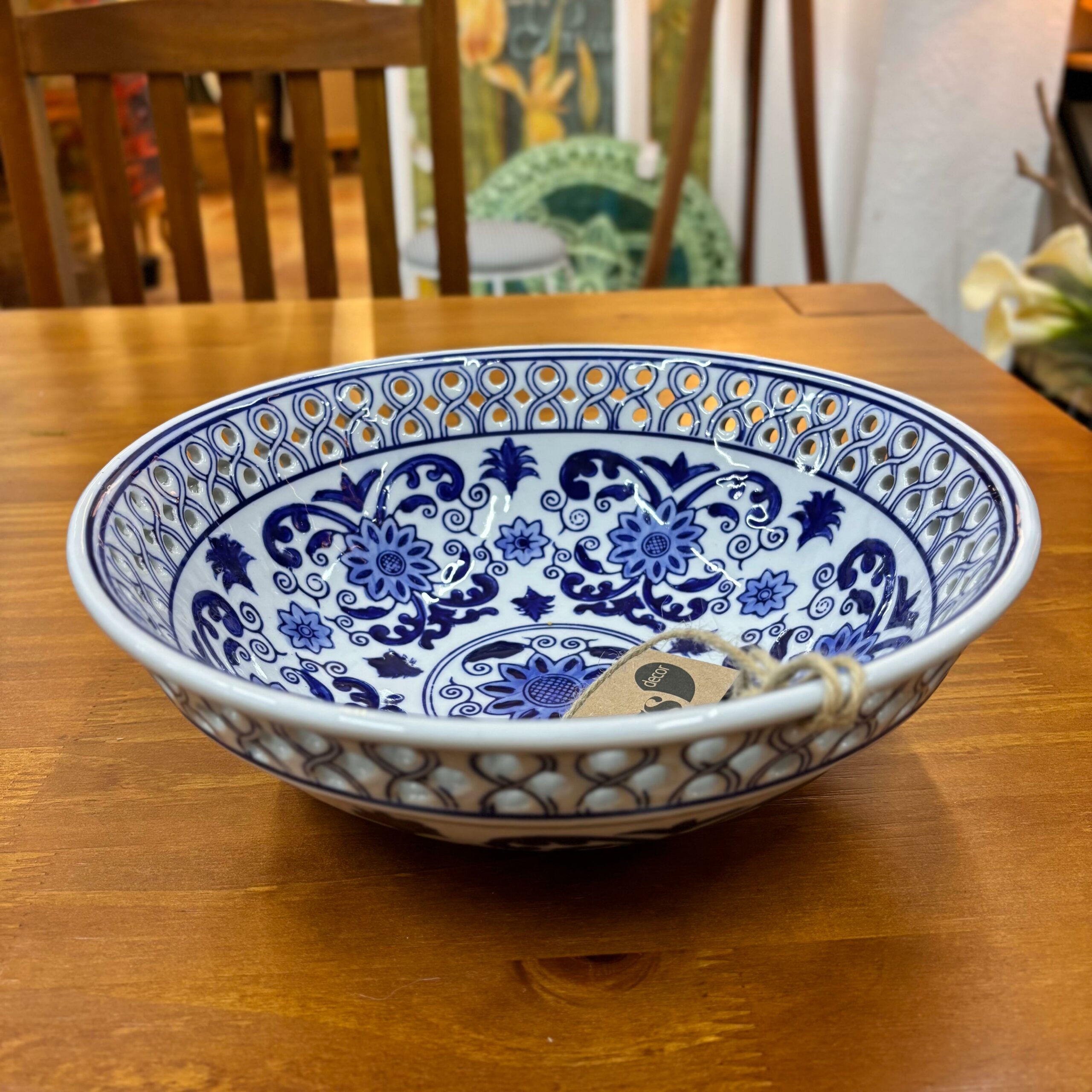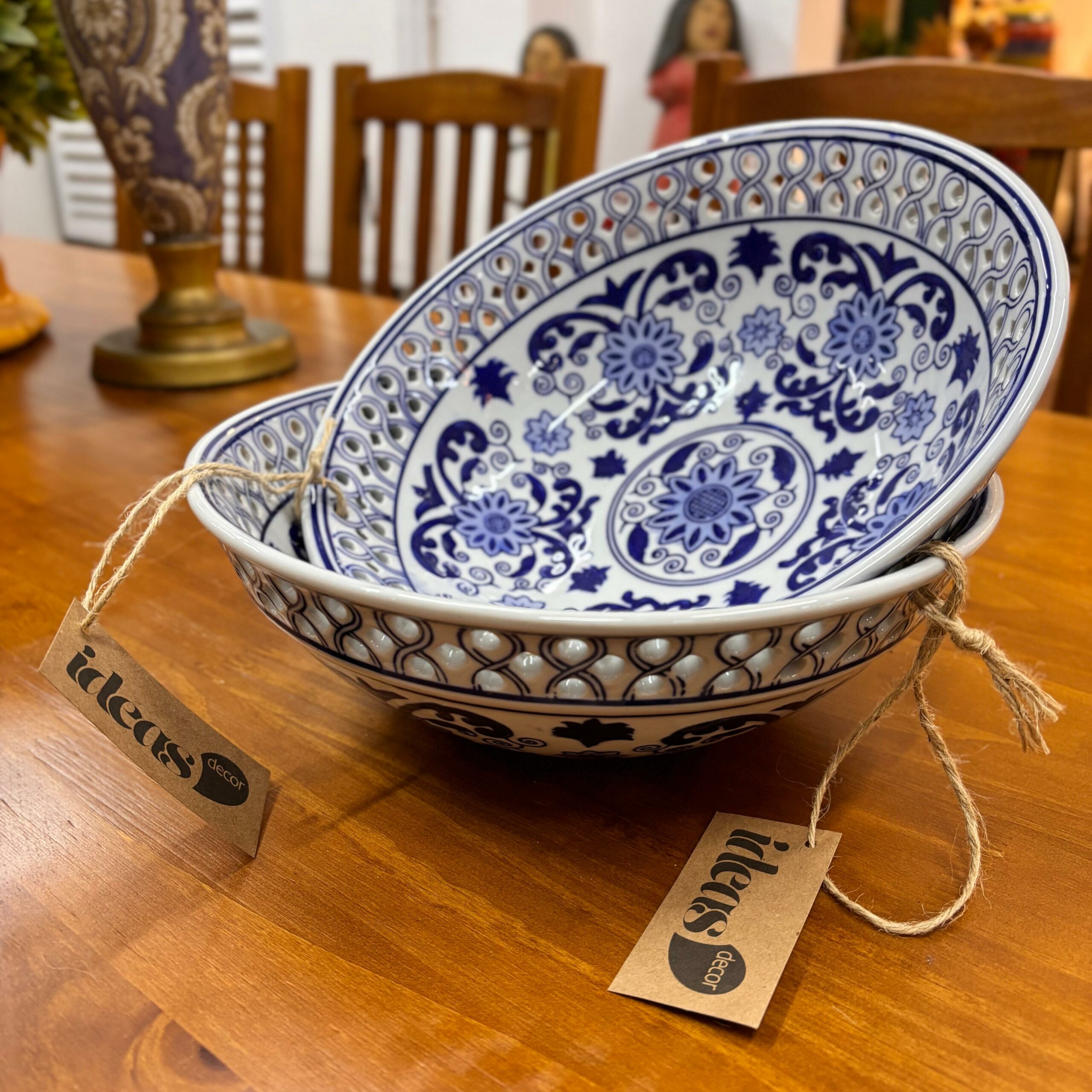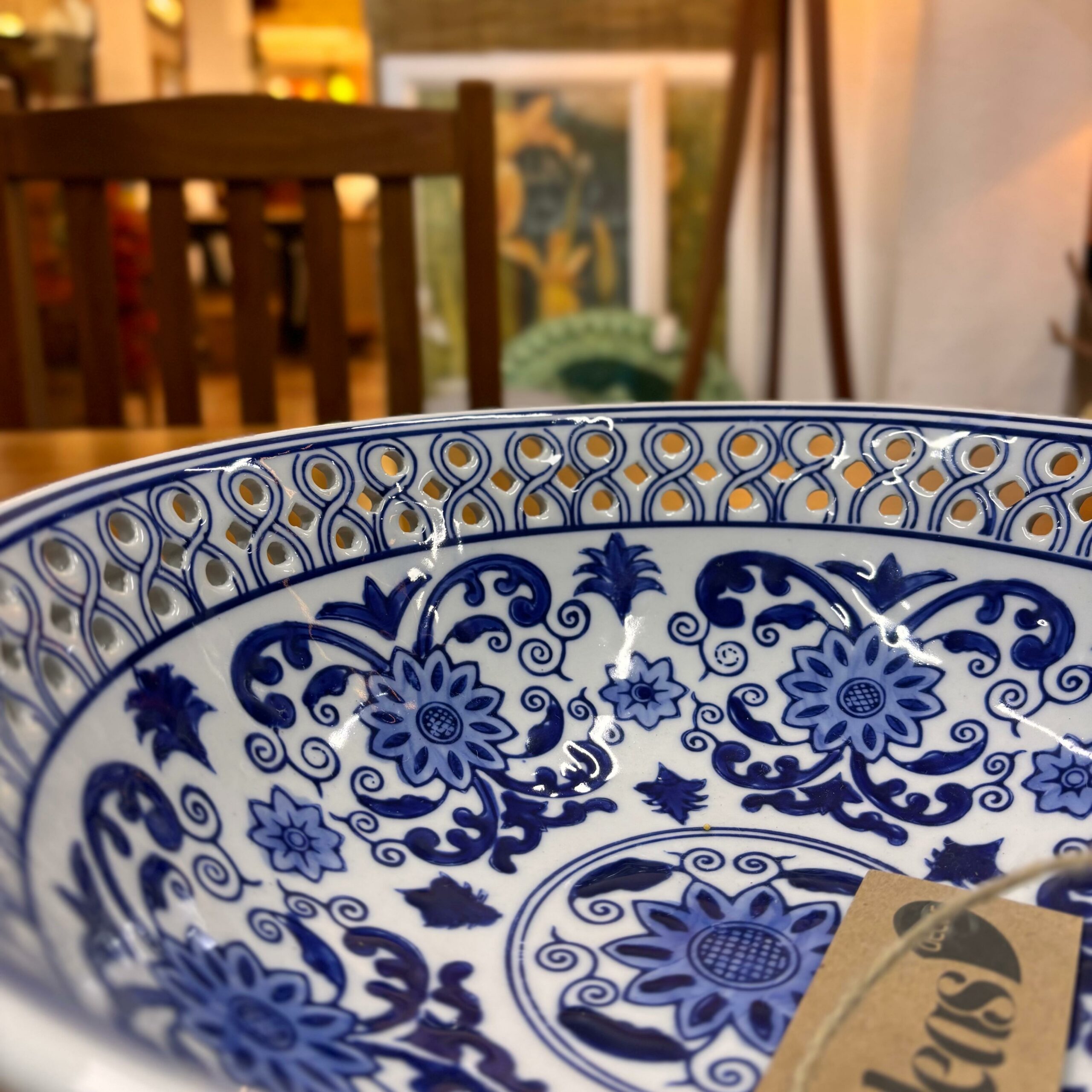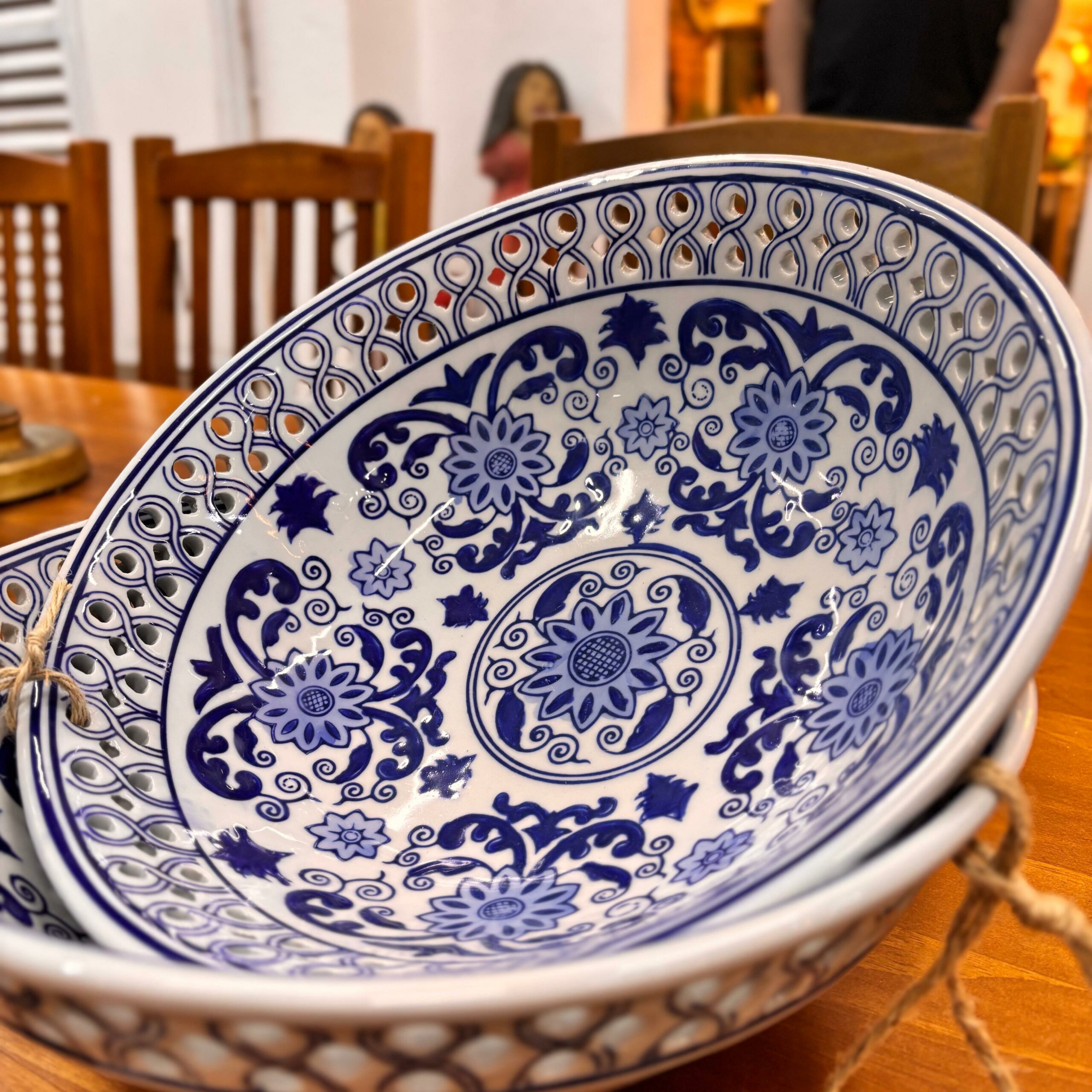 Uma peça que eleva a decoração de qualquer ambiente! Essa bacia decorativa em cerâmica esmaltada traz a tradicional combinação do azul e branco com desenhos florais e detalhes vazados na borda, criando um visual sofisticado e atemporal. Ideal para ser usada como centro de mesa, fruteira ou até como destaque em estantes e aparadores. Sua presença transforma o ambiente, valorizando composições clássicas, rústicas ou contemporâneas. Produto artesanal: pequenas variações fazem cada peça ser única.