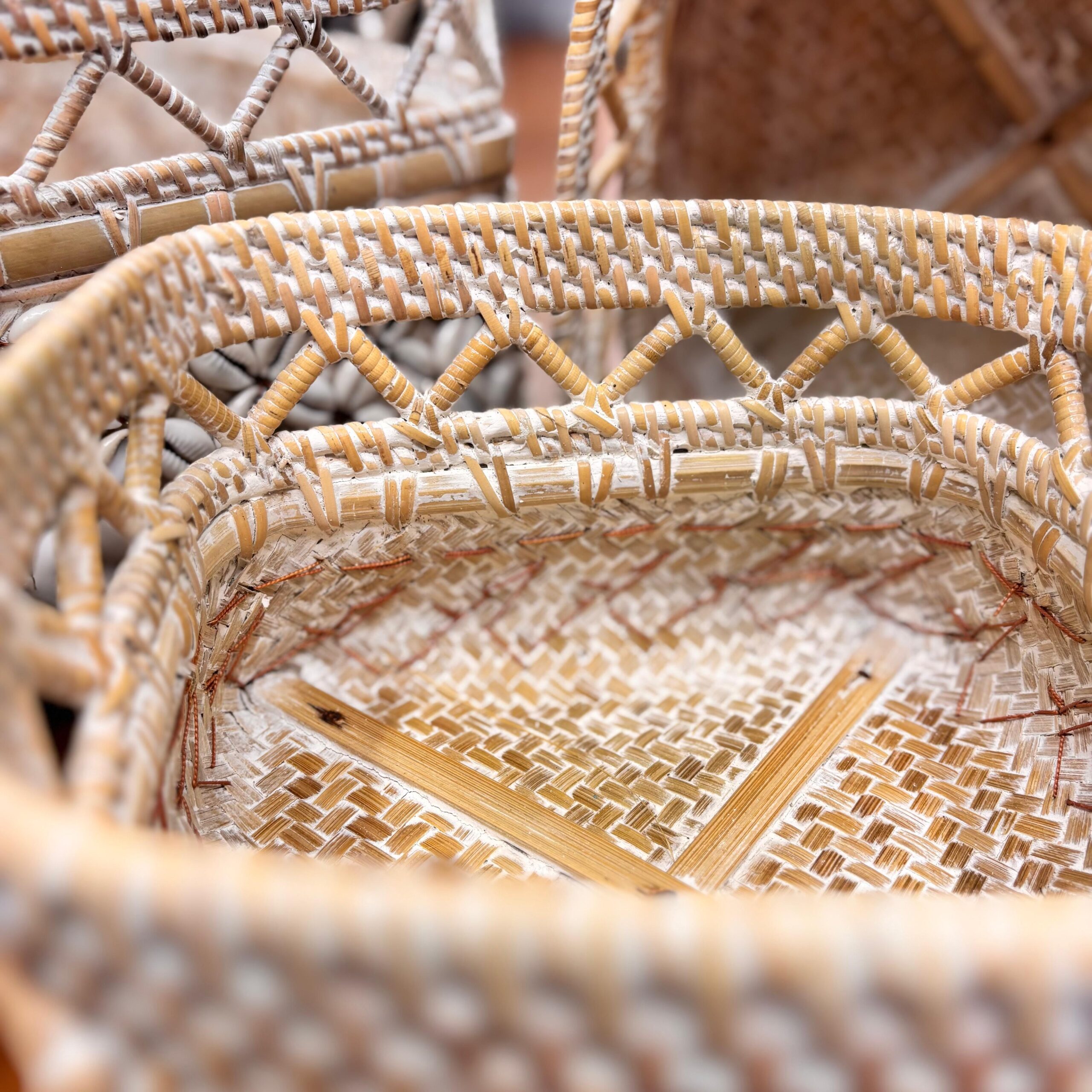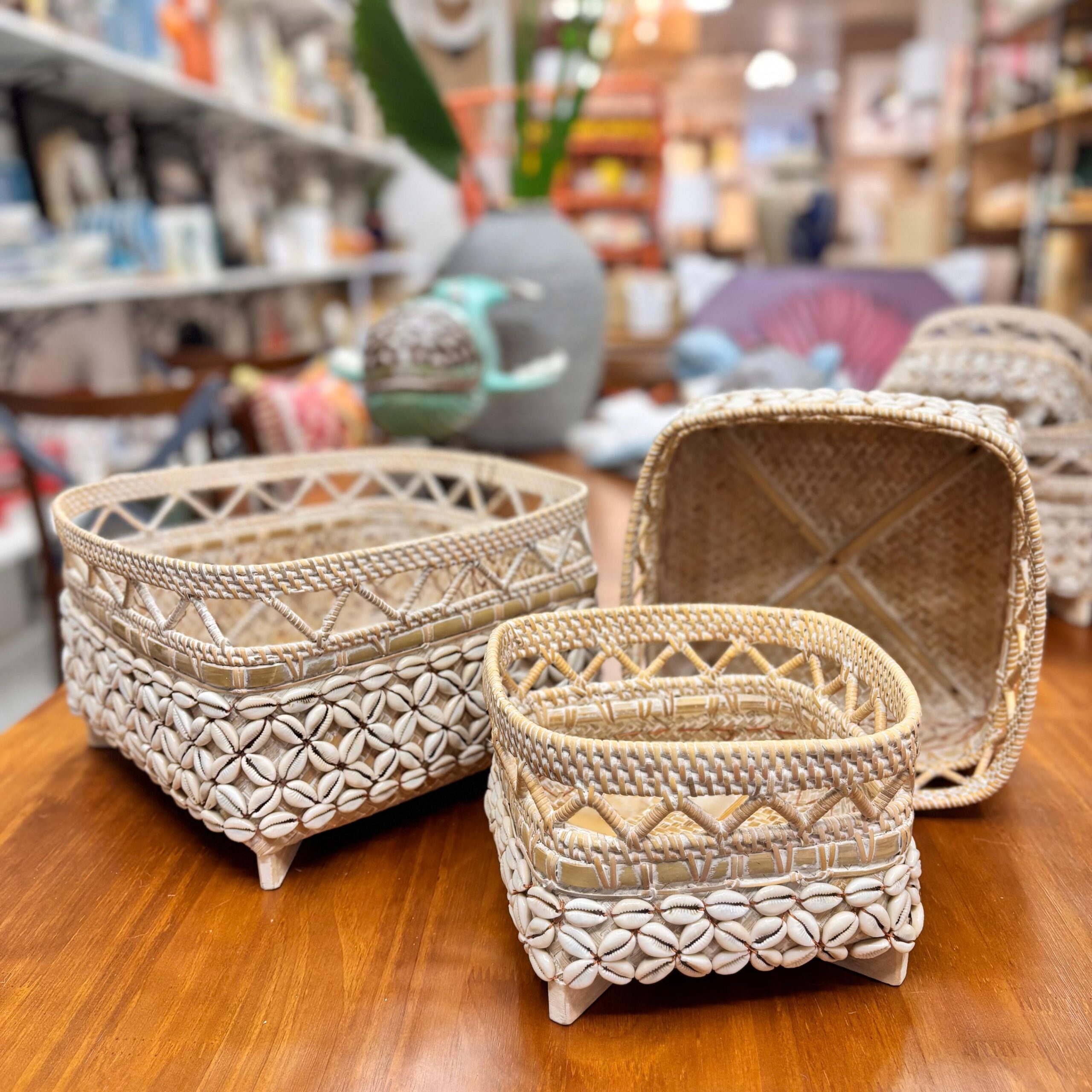 Cestaria Chique em Rattan com Búzios – Conjunto com 3 (G/M/P) | Importado de Bali Textura natural, detalhes de búzios e acabamento impecável. Este trio de cestos em fibra natural de rattan traz sofisticação artesanal e funcionalidade para salas, quartos e lavabos — perfeito para decorar e guardar controles, cosméticos, joias, perfumes, chaves e pequenos objetos.