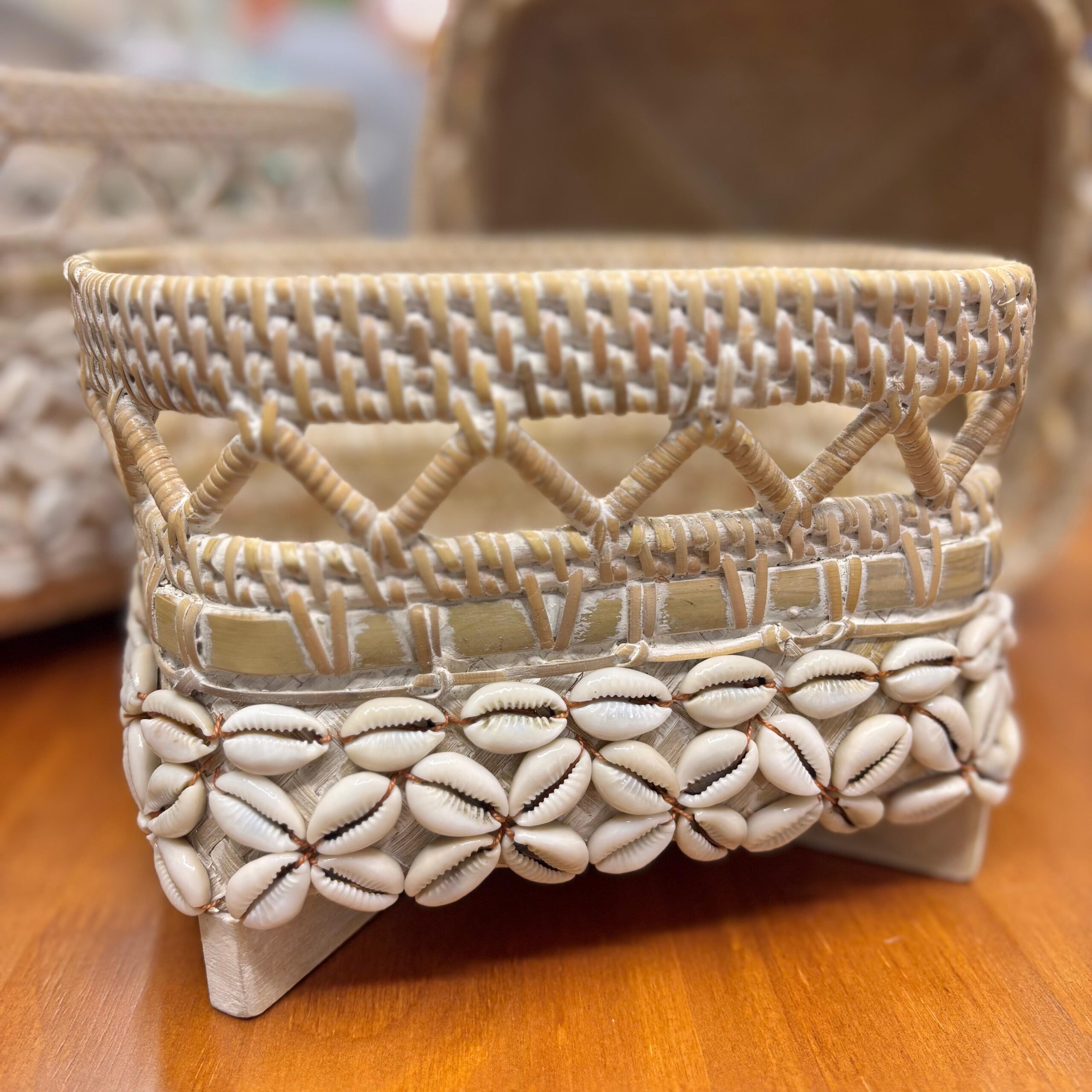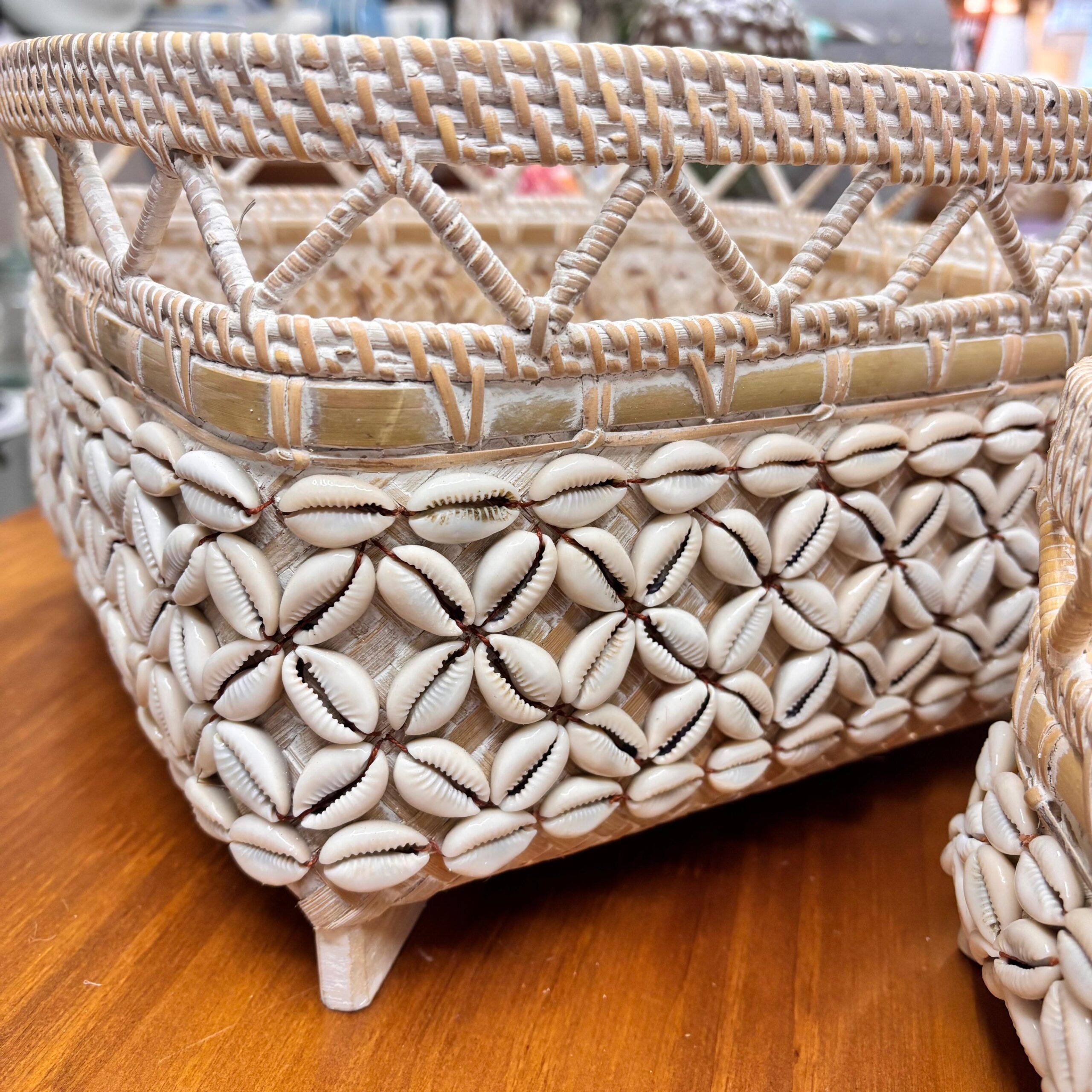 Alto padrão artesanal: rattan trançado com aplicação de búzios.
