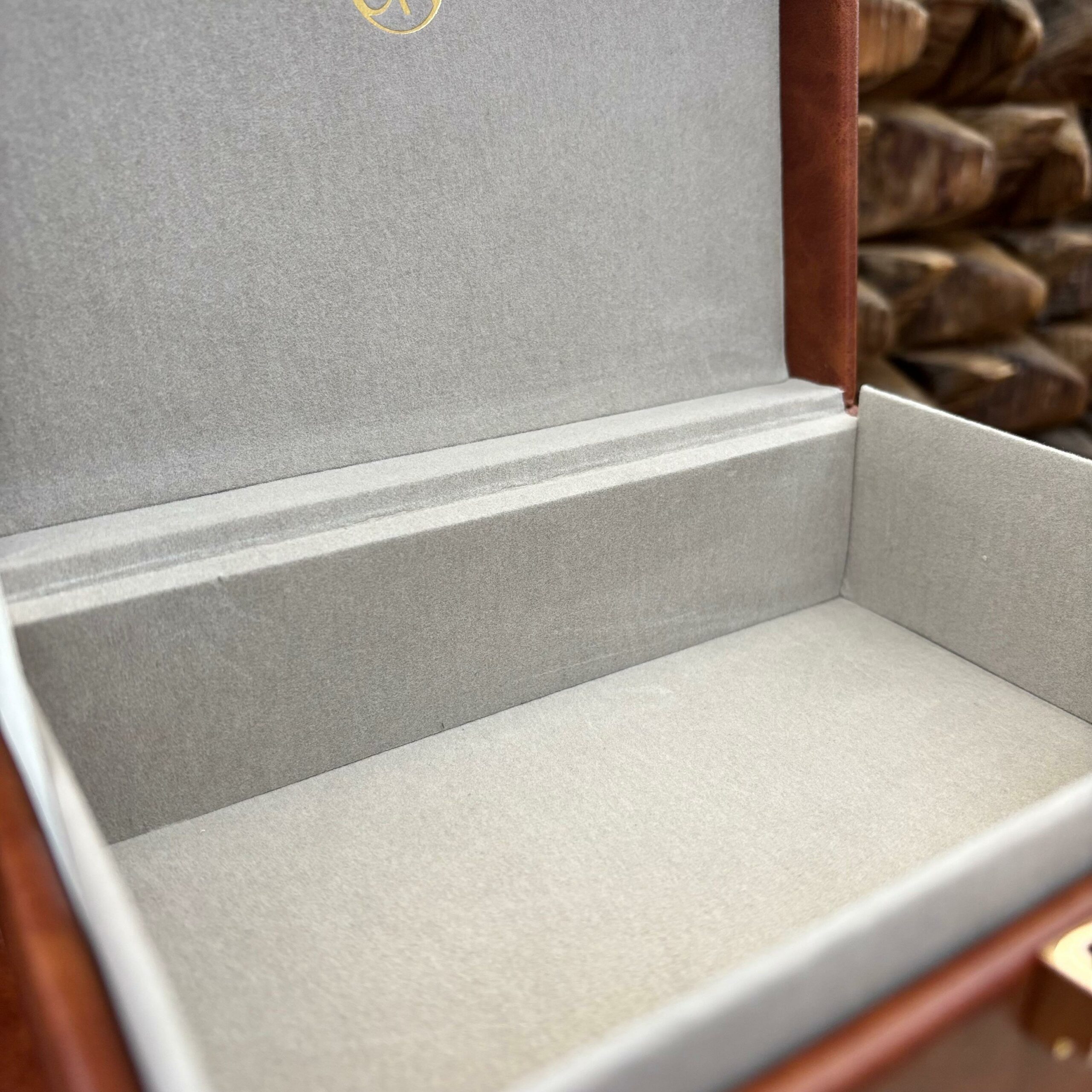 Largura: 15 cm MATERIAL: madeira revista em tecido de couro sintético. ACABAMENTO: Fino acabamento. COR: Marrom. ESTILO: Versátil, ideal para decorar e armazenar pequenos objetos.