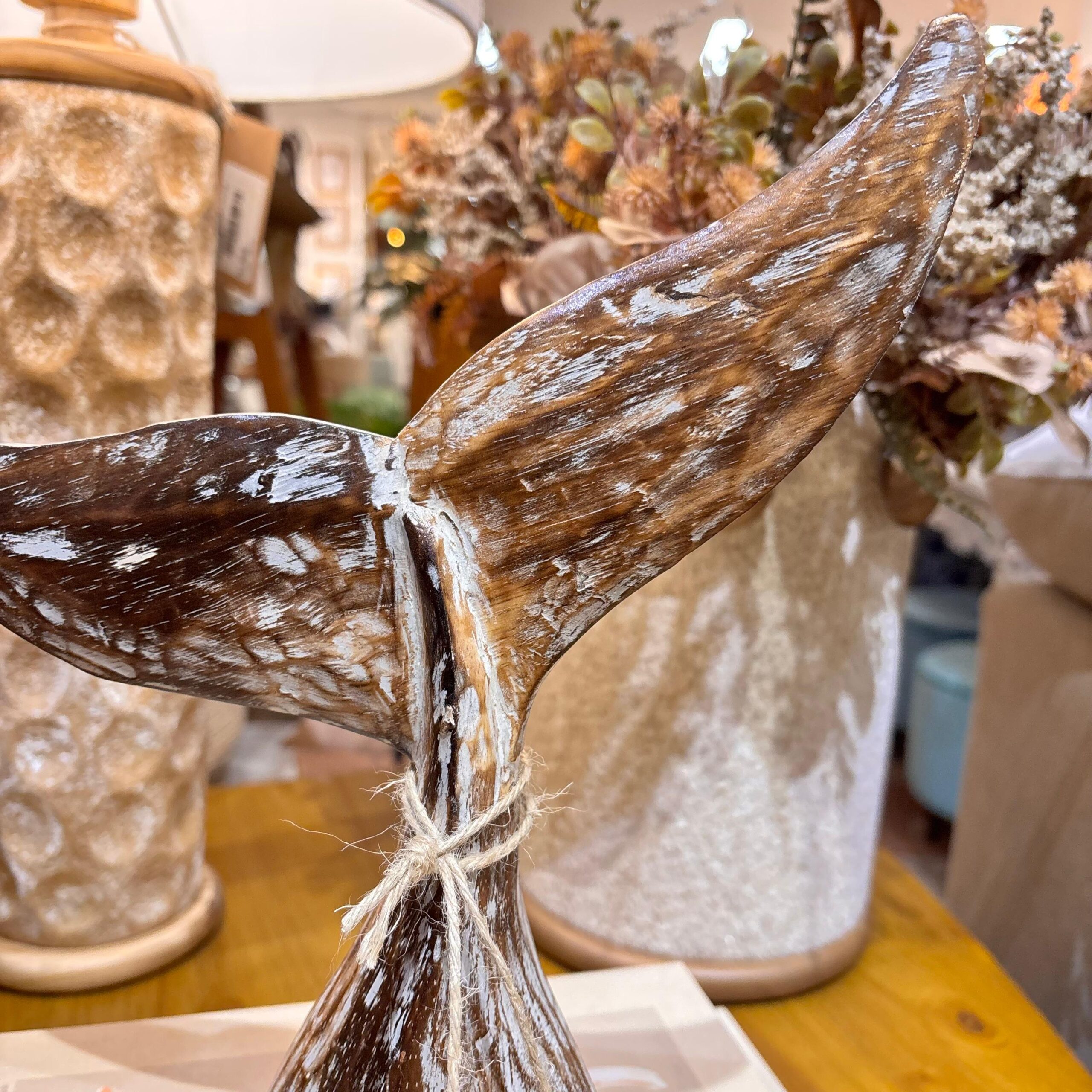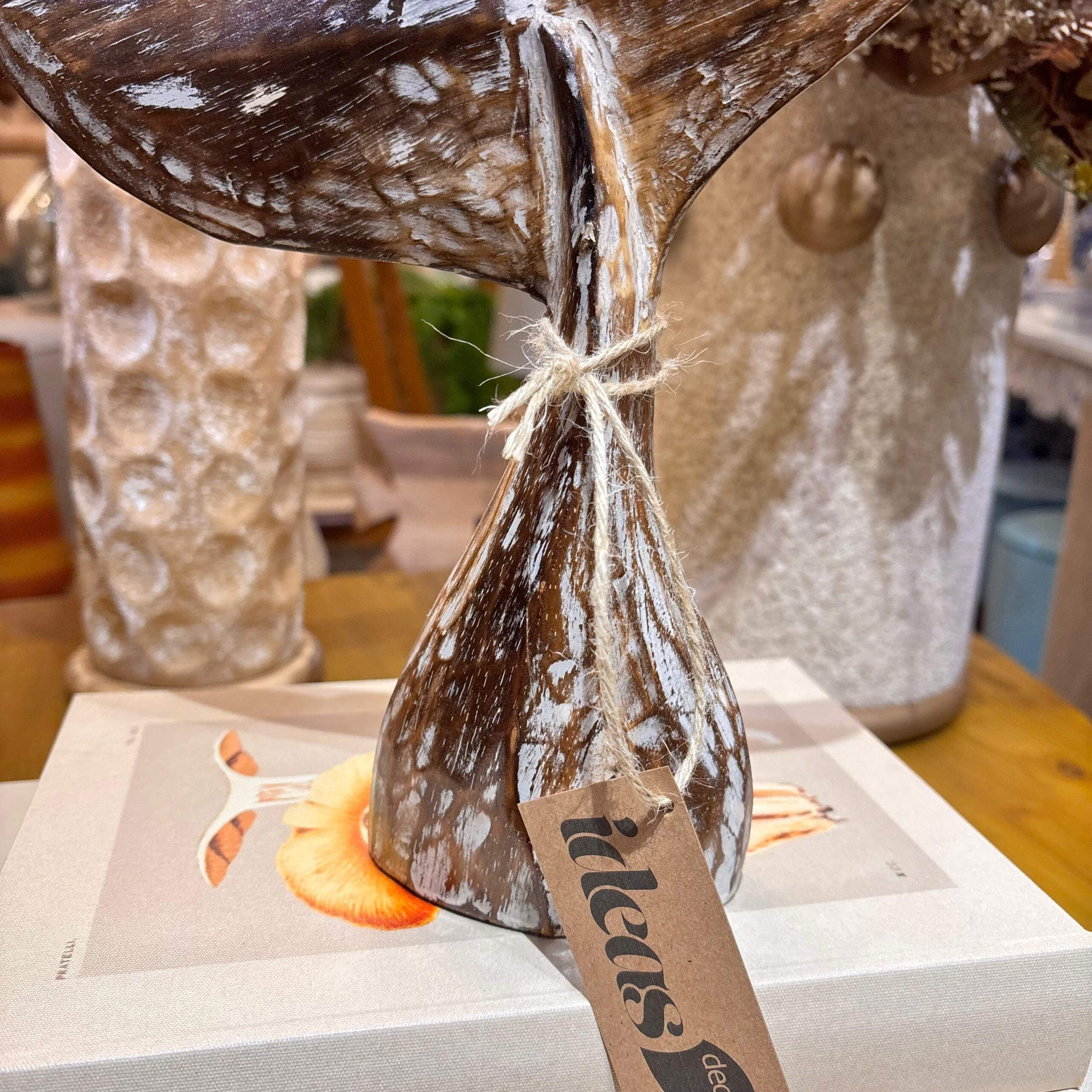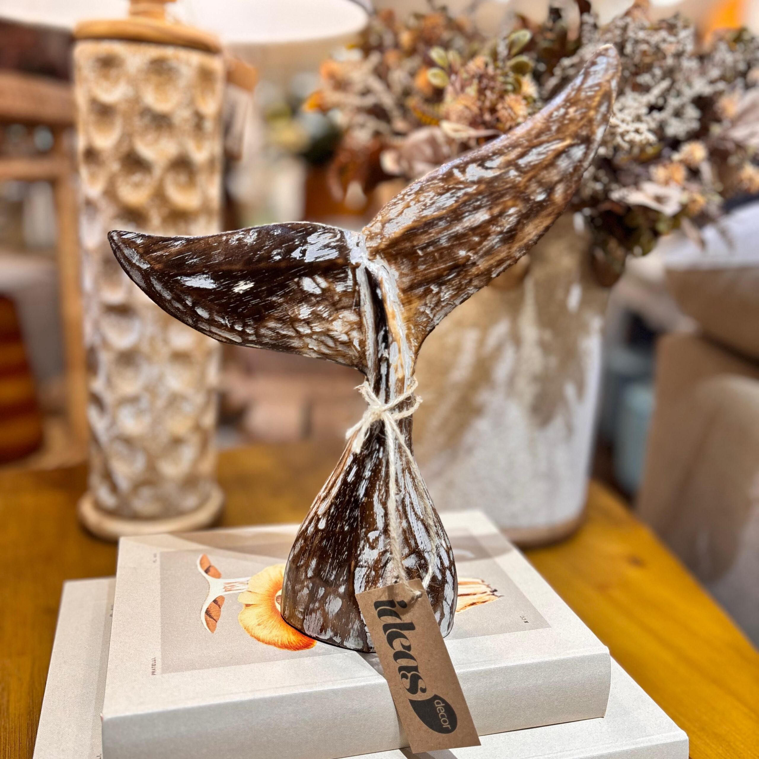 Símbolo do mar em versão artesanal. Talhada à mão em madeira rústica, esta escultura de rabo de baleia leva textura orgânica e presença elegante ao décor coastal-chic — perfeita para aparadores, mesas laterais e estantes.