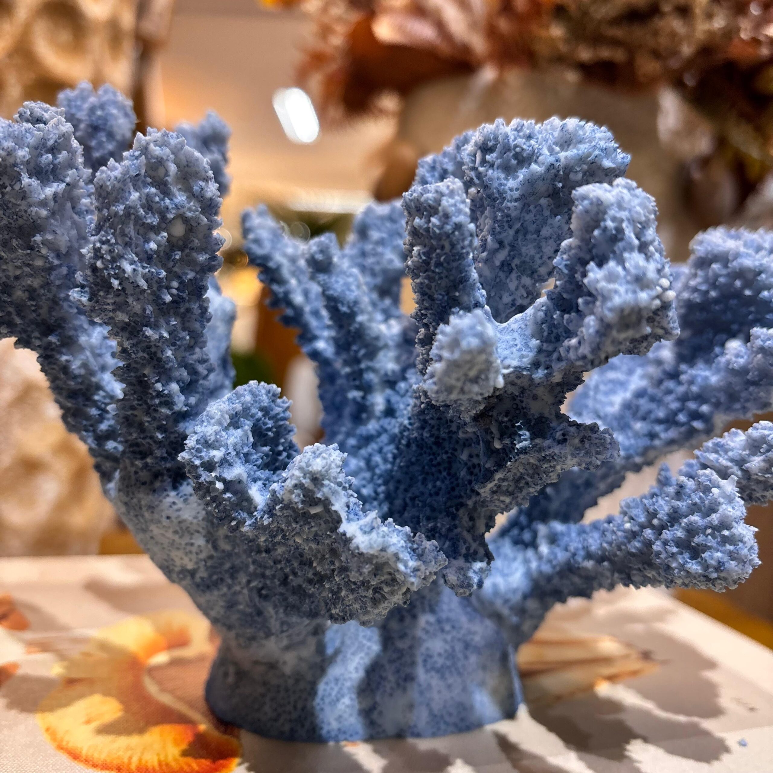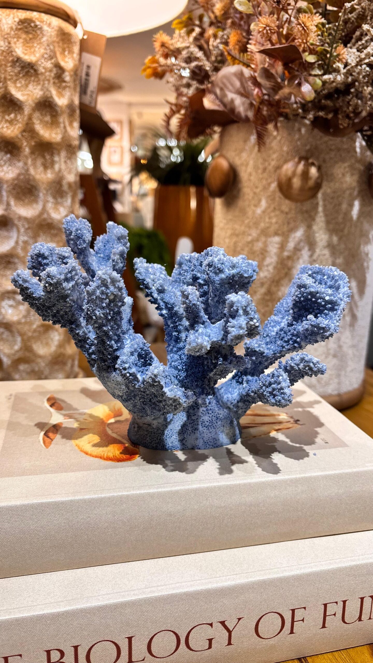 Frescor marítimo em um ponto de cor elegante. Em resina com textura realista, o coral azul eleva composições sobre livros, bandejas e aparadores, trazendo leveza e personalidade ao décor coastal-chic.