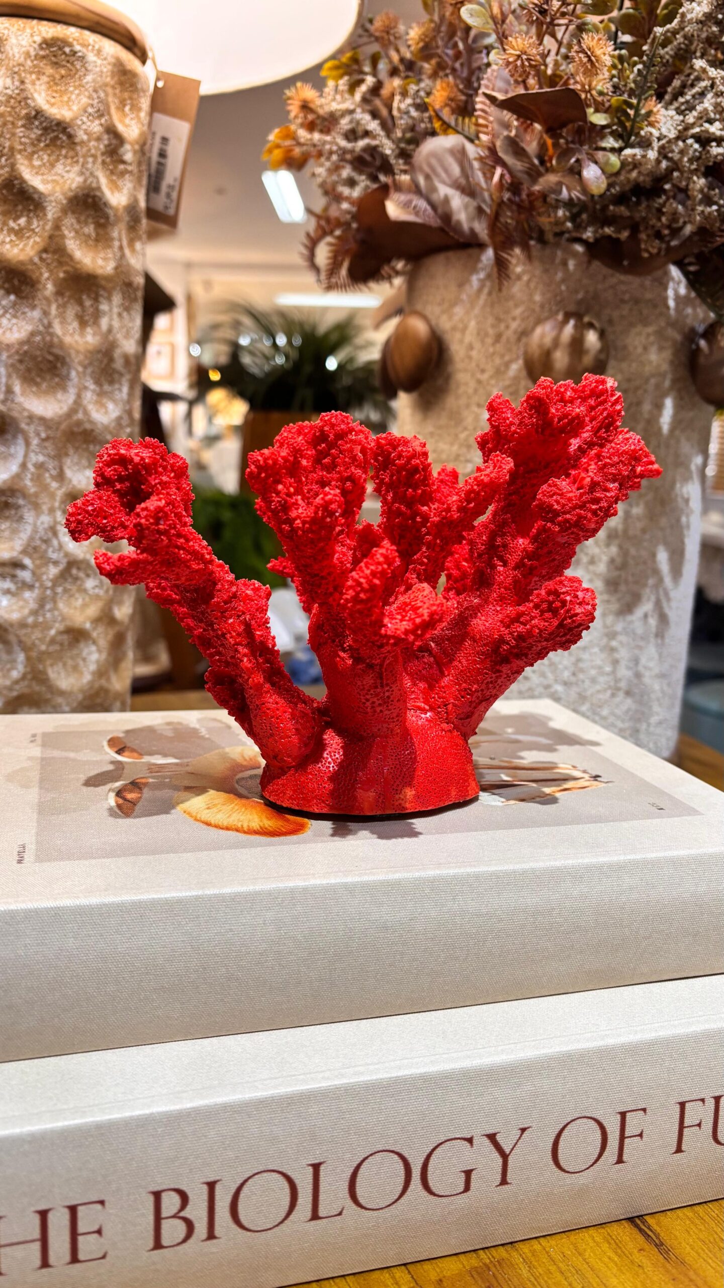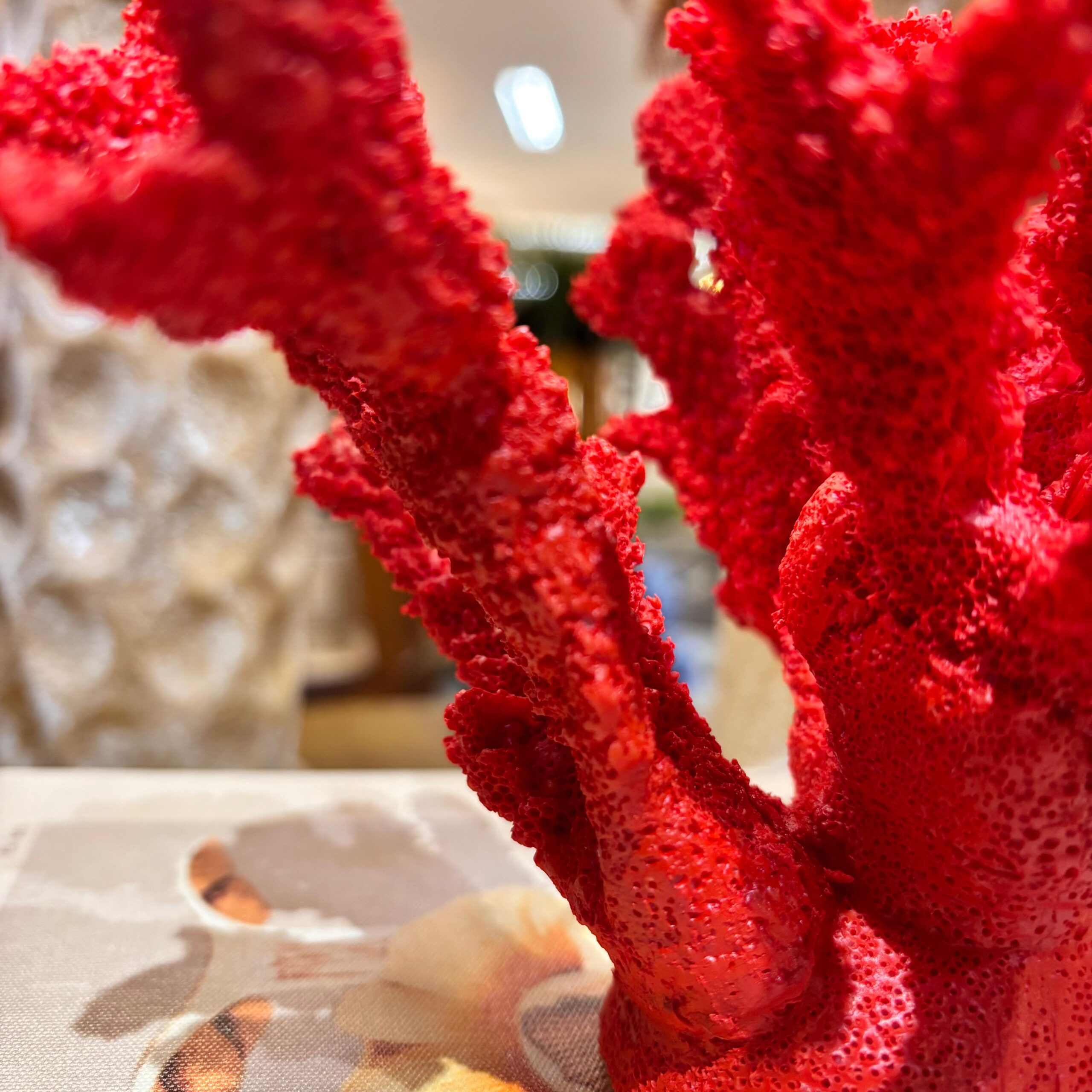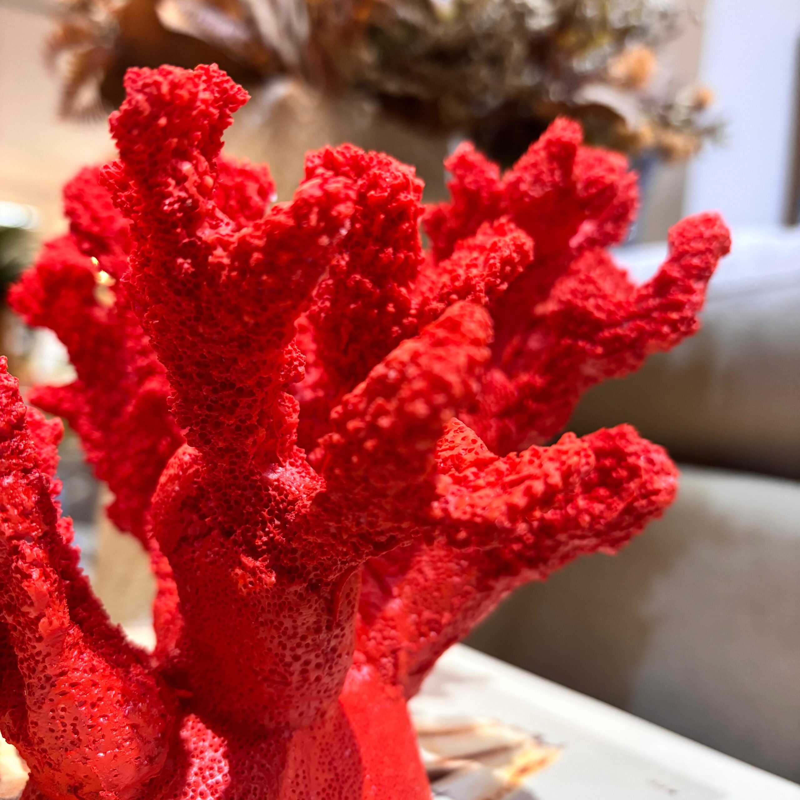 Um ponto de cor que valoriza o estilo coastal-chic. Em resina com textura realista, o coral vermelho ilumina composições sobre livros, bandejas e aparadores, trazendo leveza e personalidade ao ambiente.