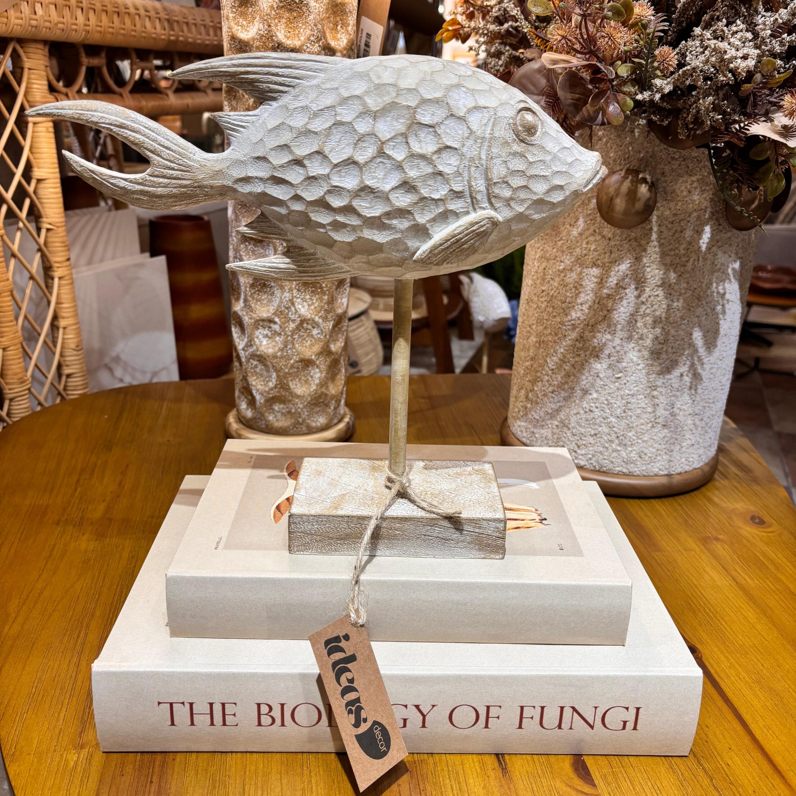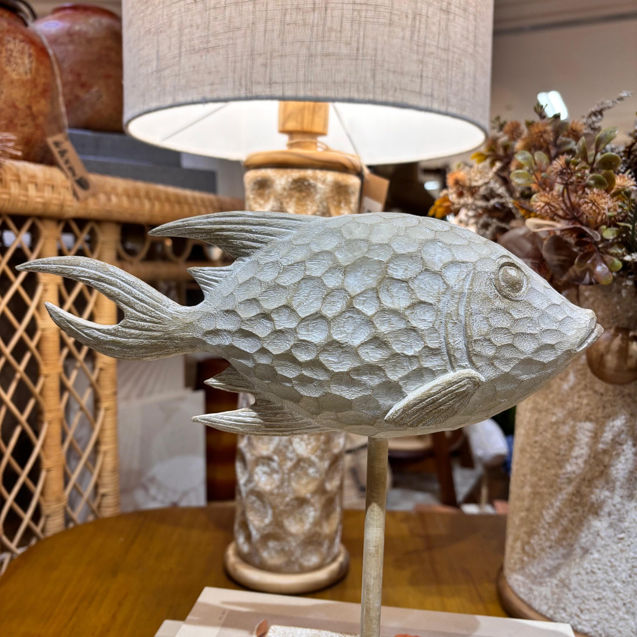 Um toque marítimo com estética artesanal. Talhada em madeira rústica e finalizada com detalhes em resina, esta escultura de peixe traz textura, leve brilho e personalidade ao décor — perfeita para aparadores, mesas laterais e estantes.