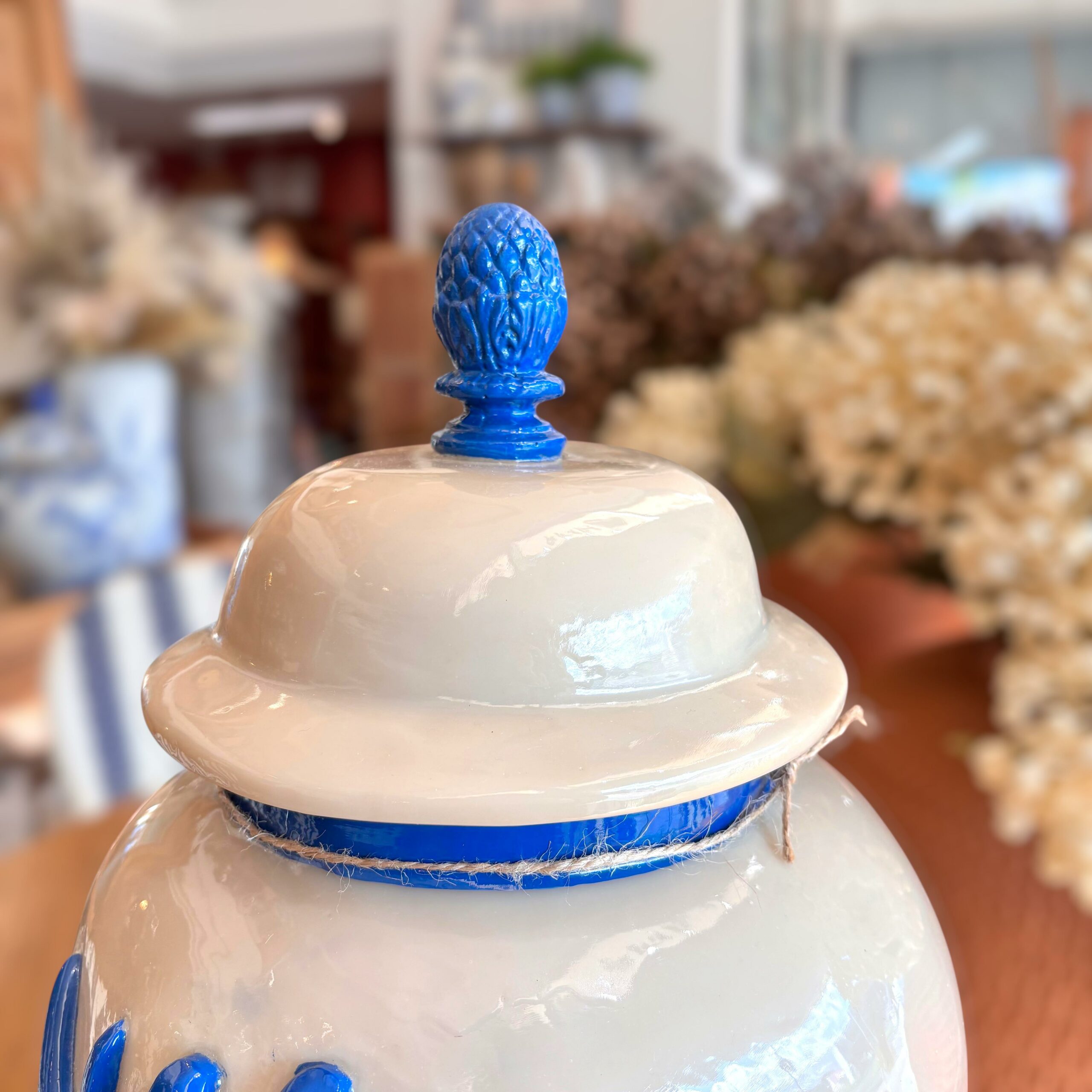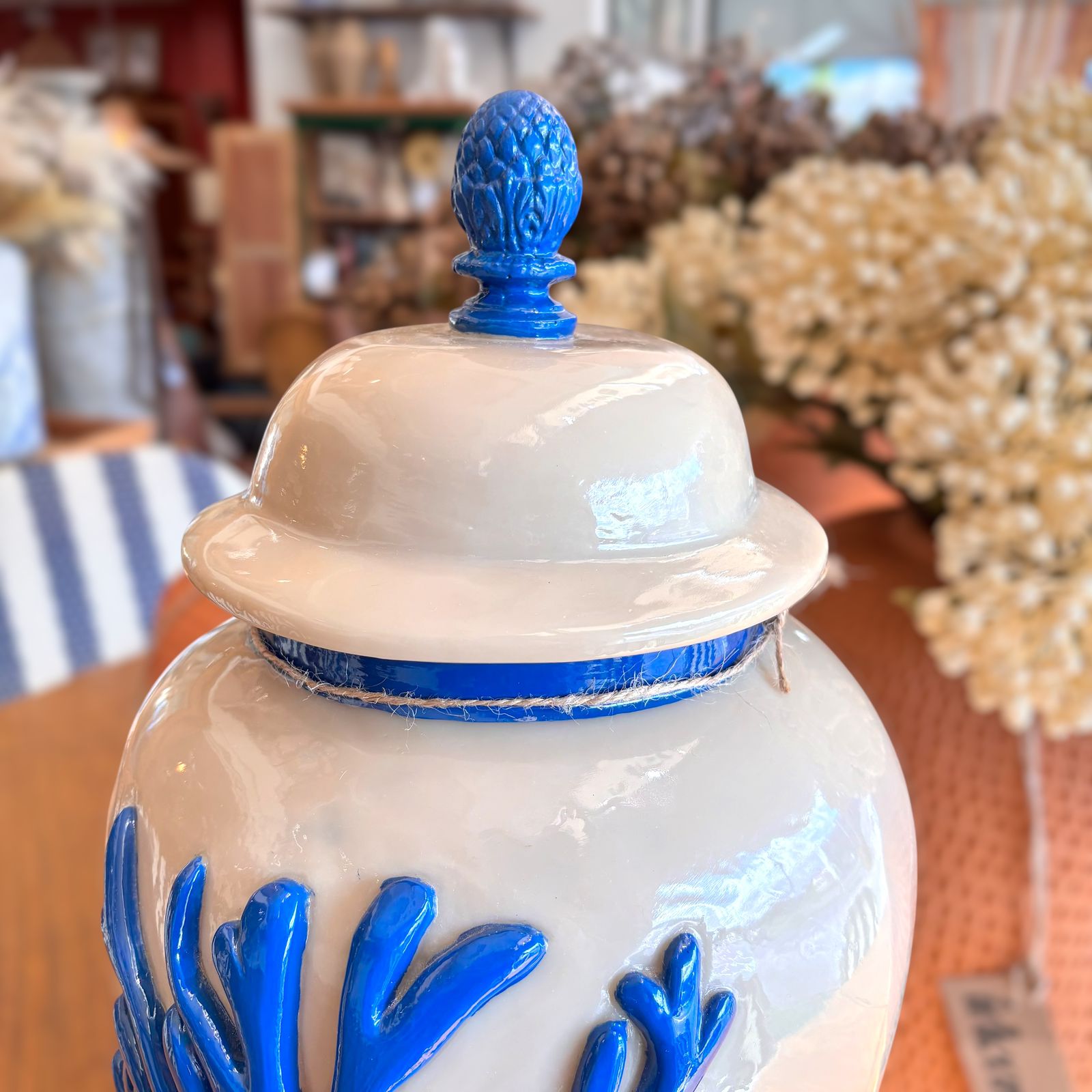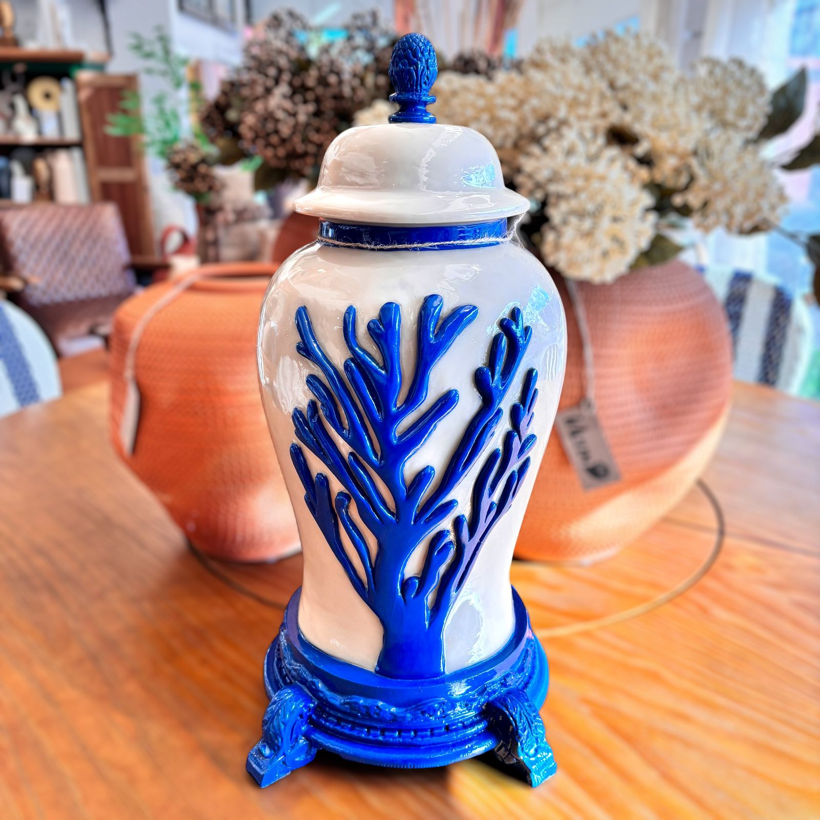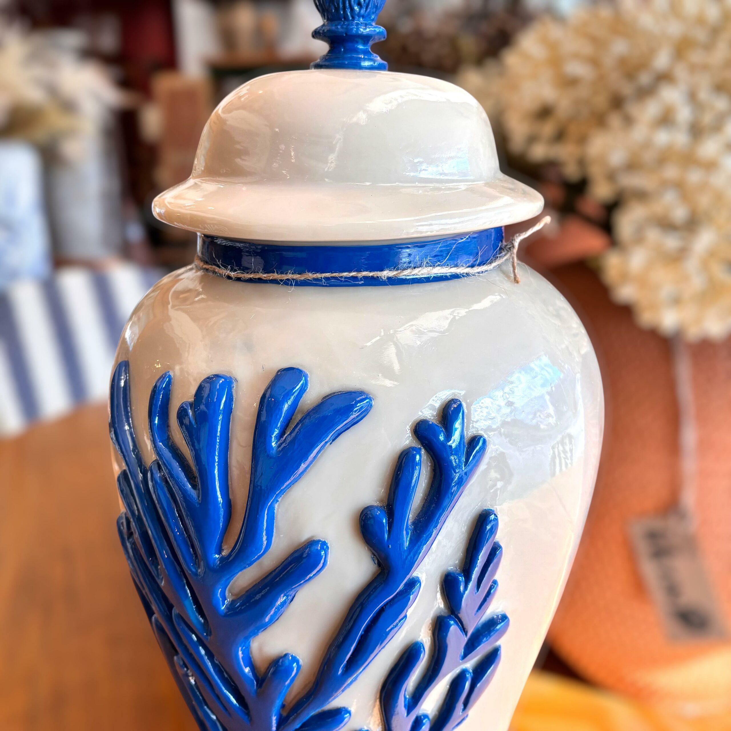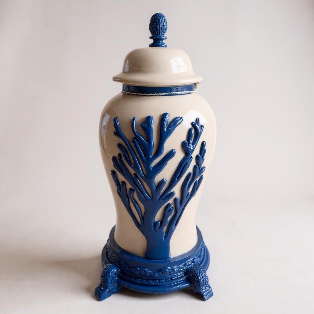 Potiche decorativo em resina com acabamento refinado nas cores bege claro e azul. Com 56 cm de altura, é uma peça versátil e imponente para compor ambientes sofisticados. Tampa fixa. Ideal para destacar aparadores, buffets ou estantes com elegância.