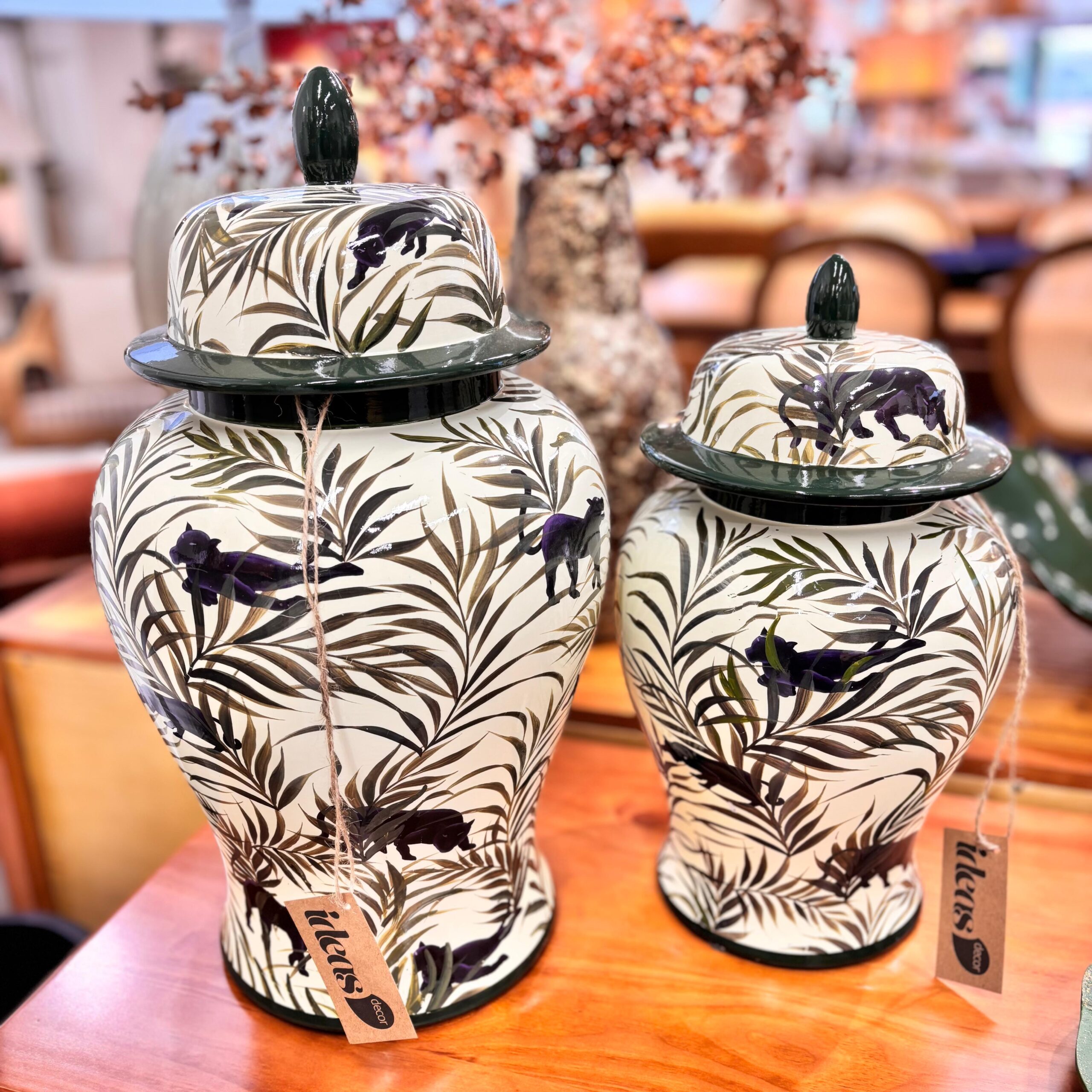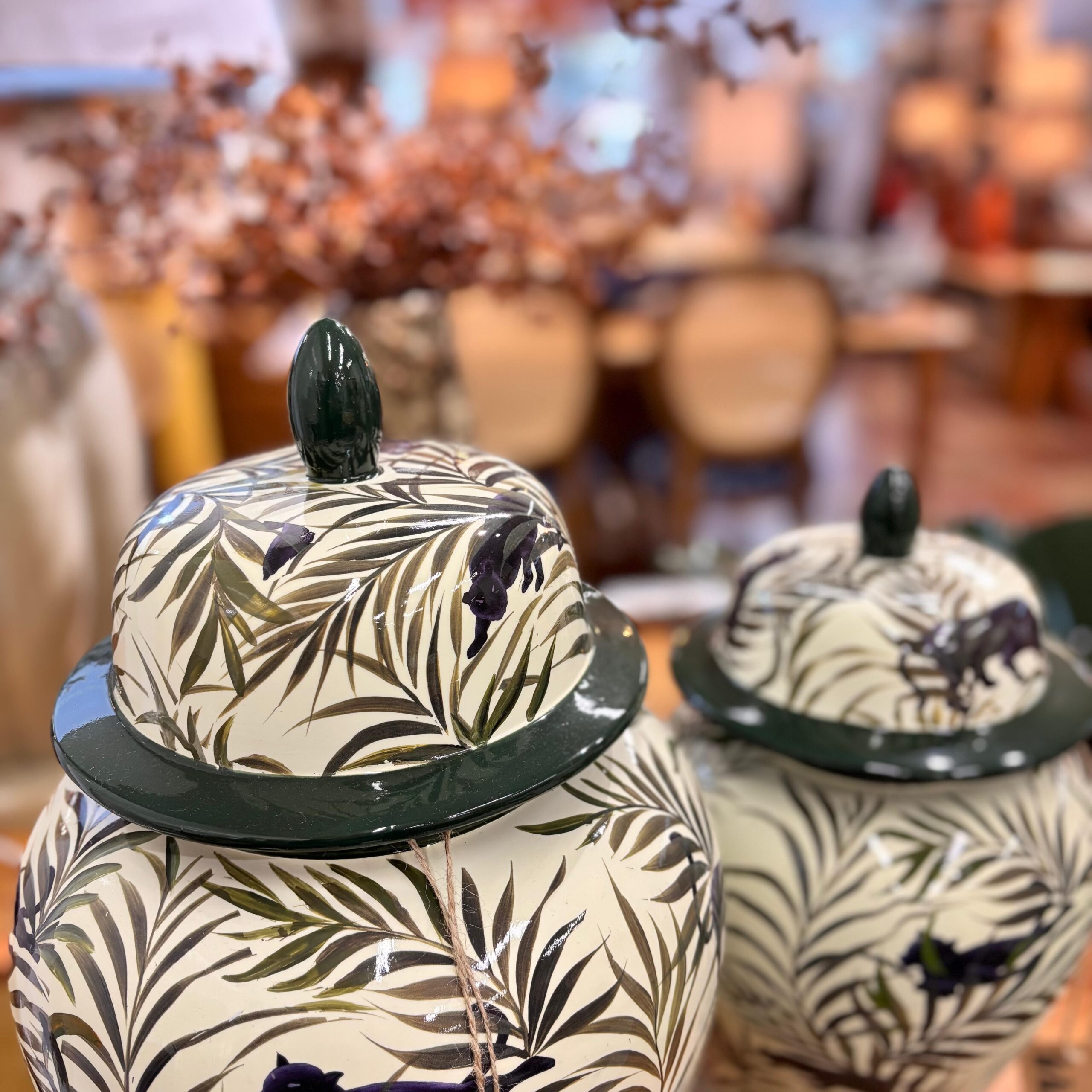 Charme botânico em tamanho perfeito para composições. Em cerâmica com fino acabamento, este potiche traz estampa de folhagens com felinos e brilho sutil, ideal para aparadores, mesas laterais e estantes. A tampa é solta, pensado para uso decorativo.