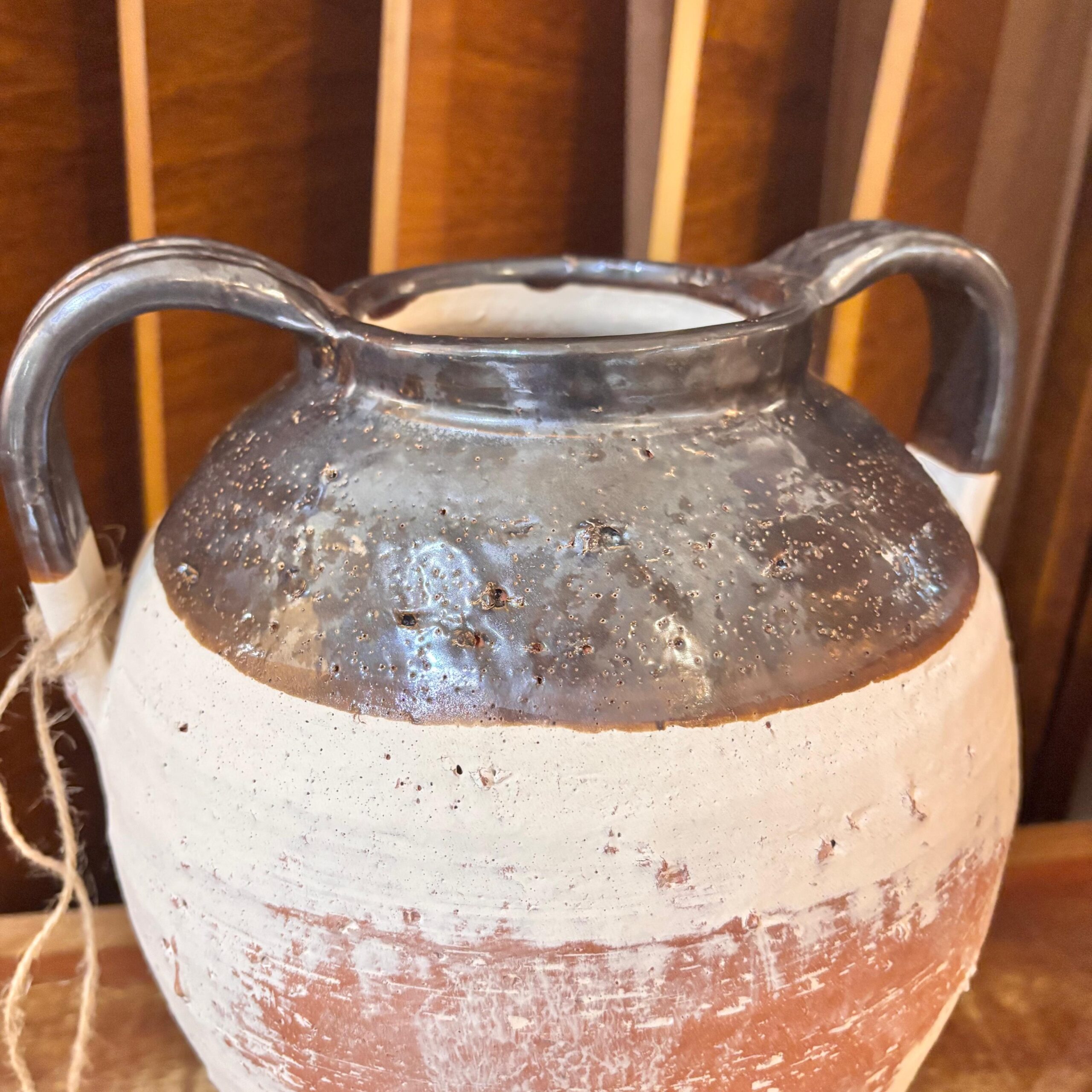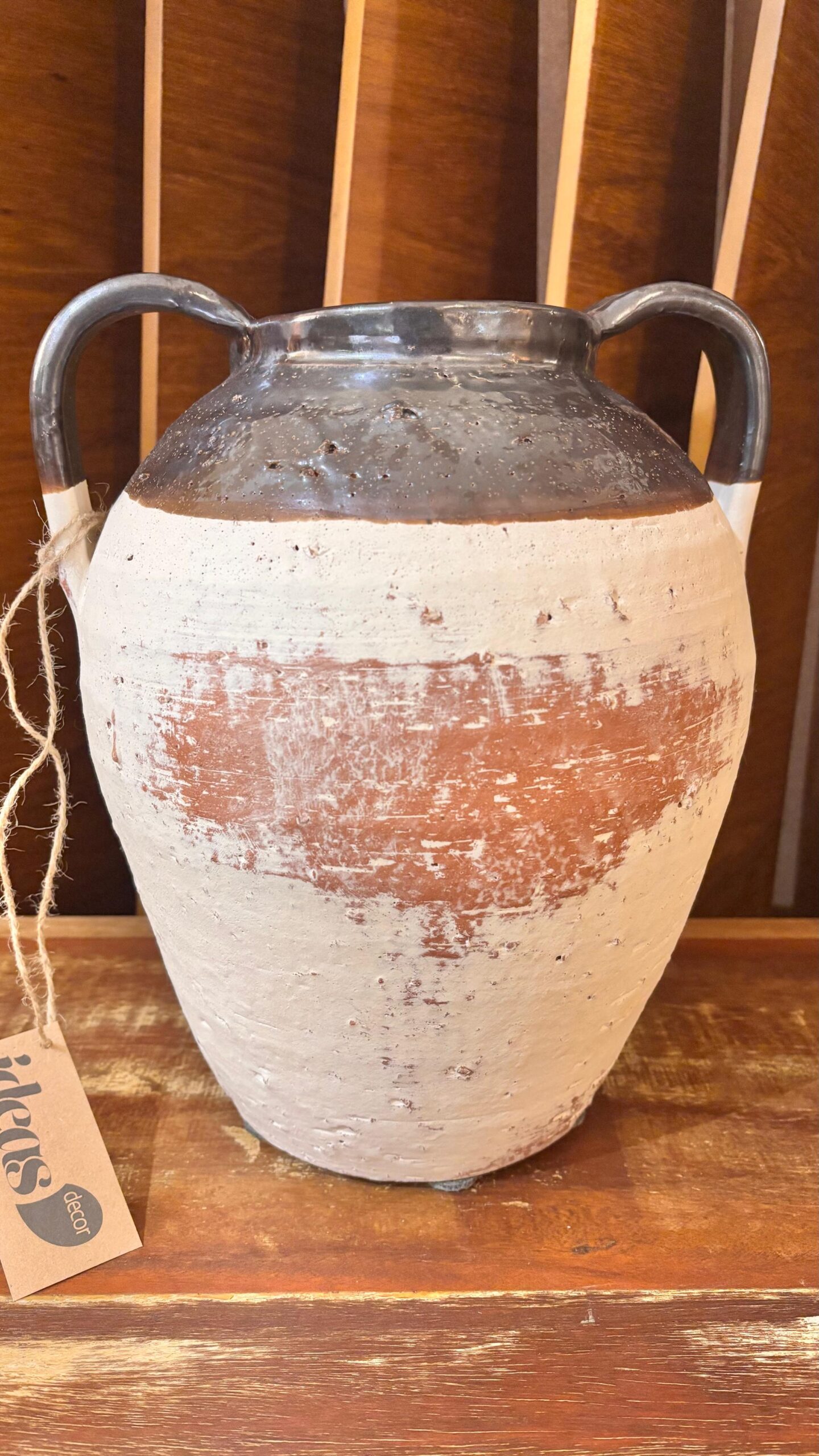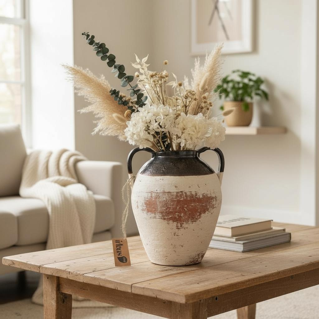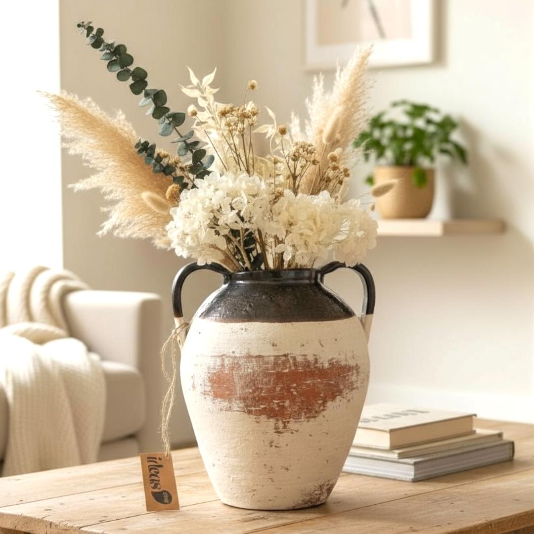 Textura artesanal e charme atemporal. Produzido em cerâmica artesanal com fino acabamento, este vaso rústico valoriza arranjos secos/verde ou pode ser usado solo como peça escultural em aparadores, mesas de centro e prateleiras.