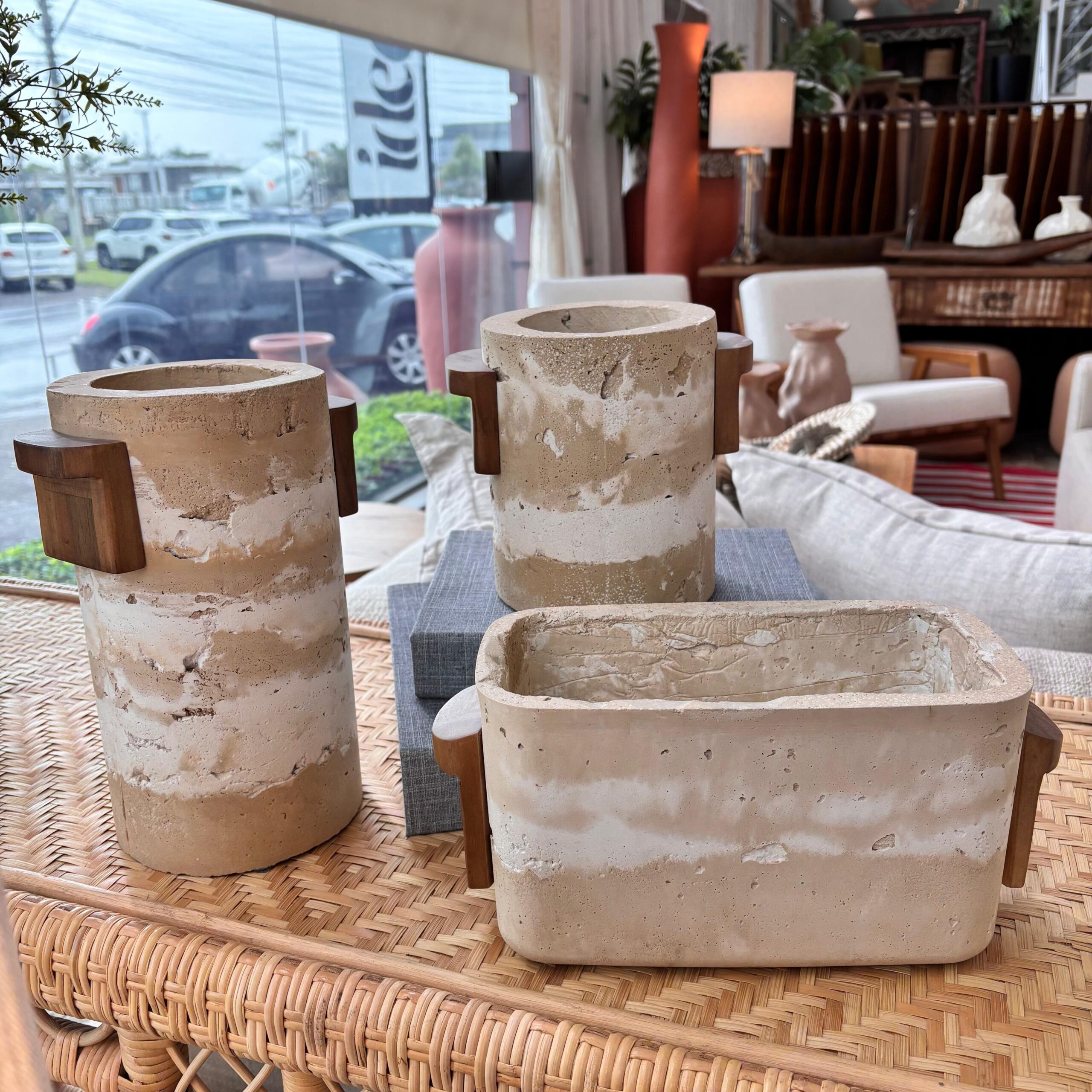 Design contemporâneo com textura natural. O corpo em cimento contrasta com apliques em madeira, criando um vaso de fino acabamento que funciona com arranjos verdes/secos ou solo como objeto escultural — perfeito para aparadores, mesas laterais e bancadas.