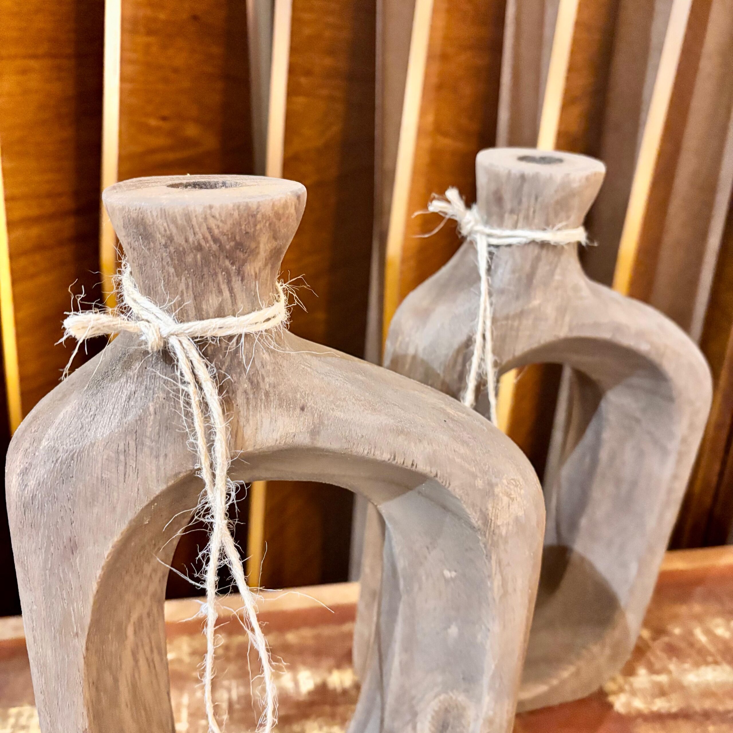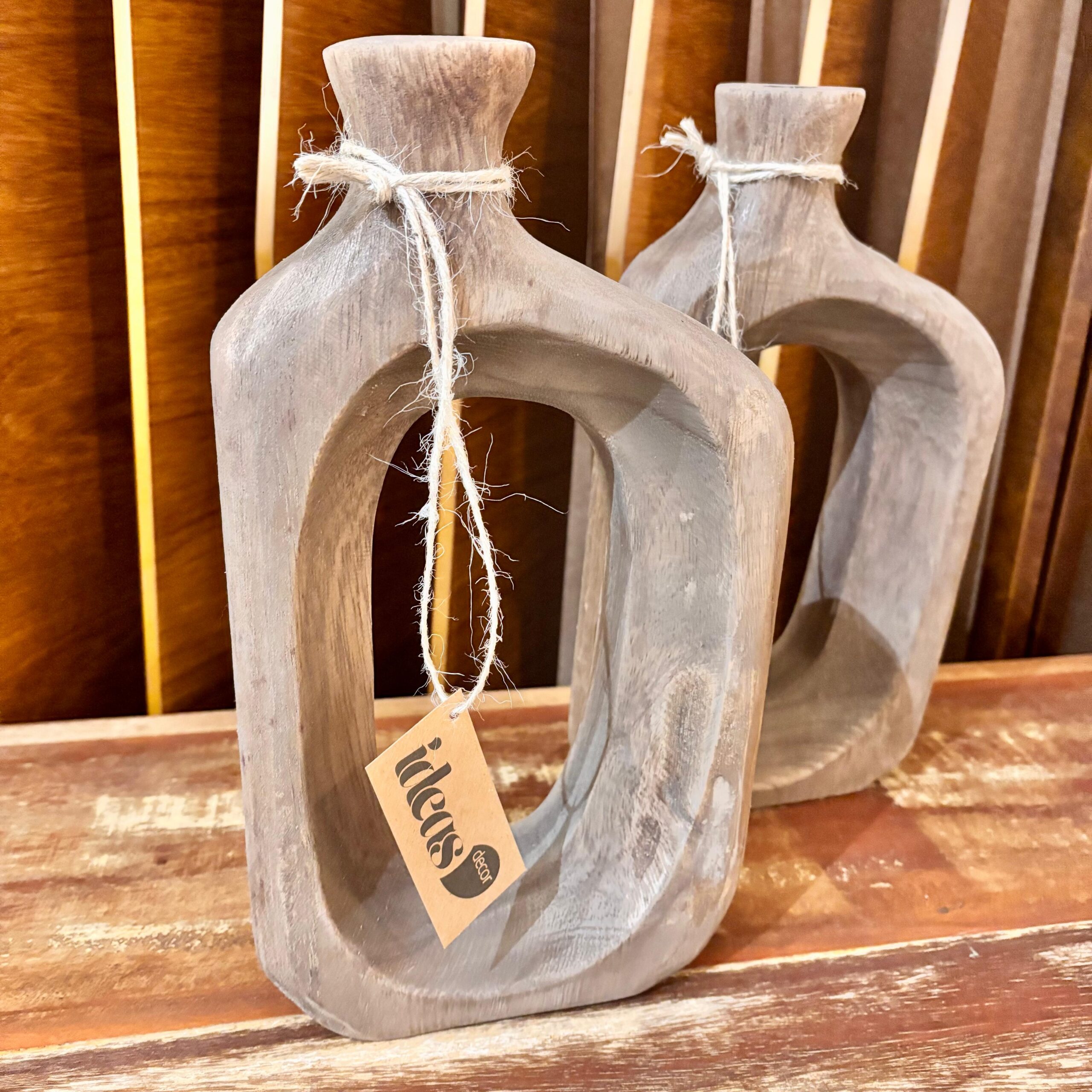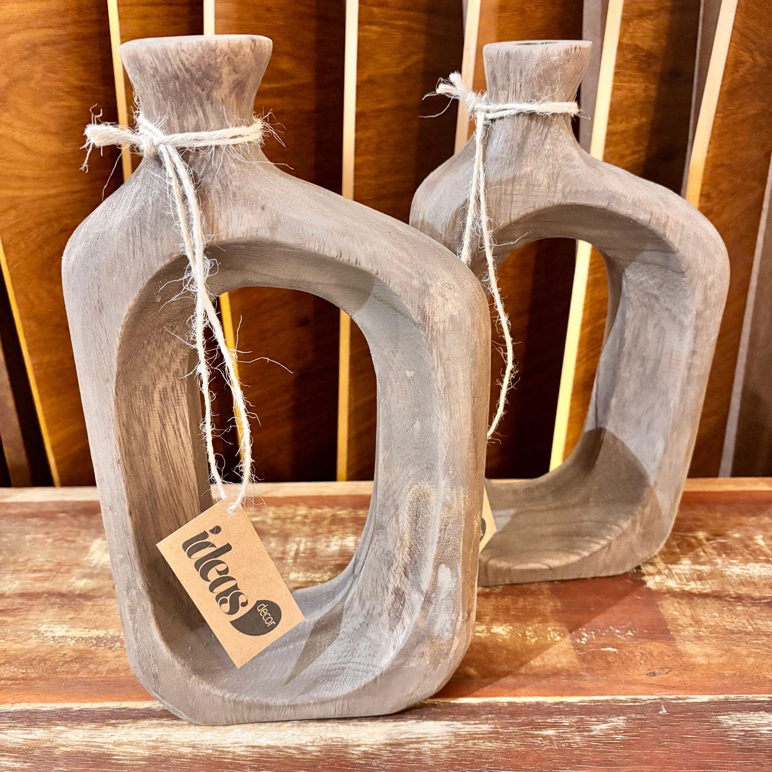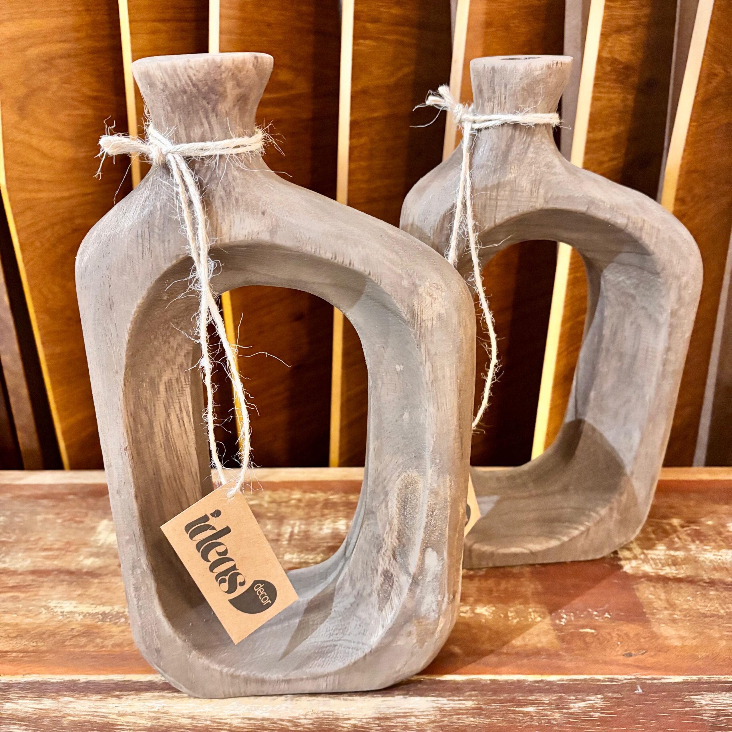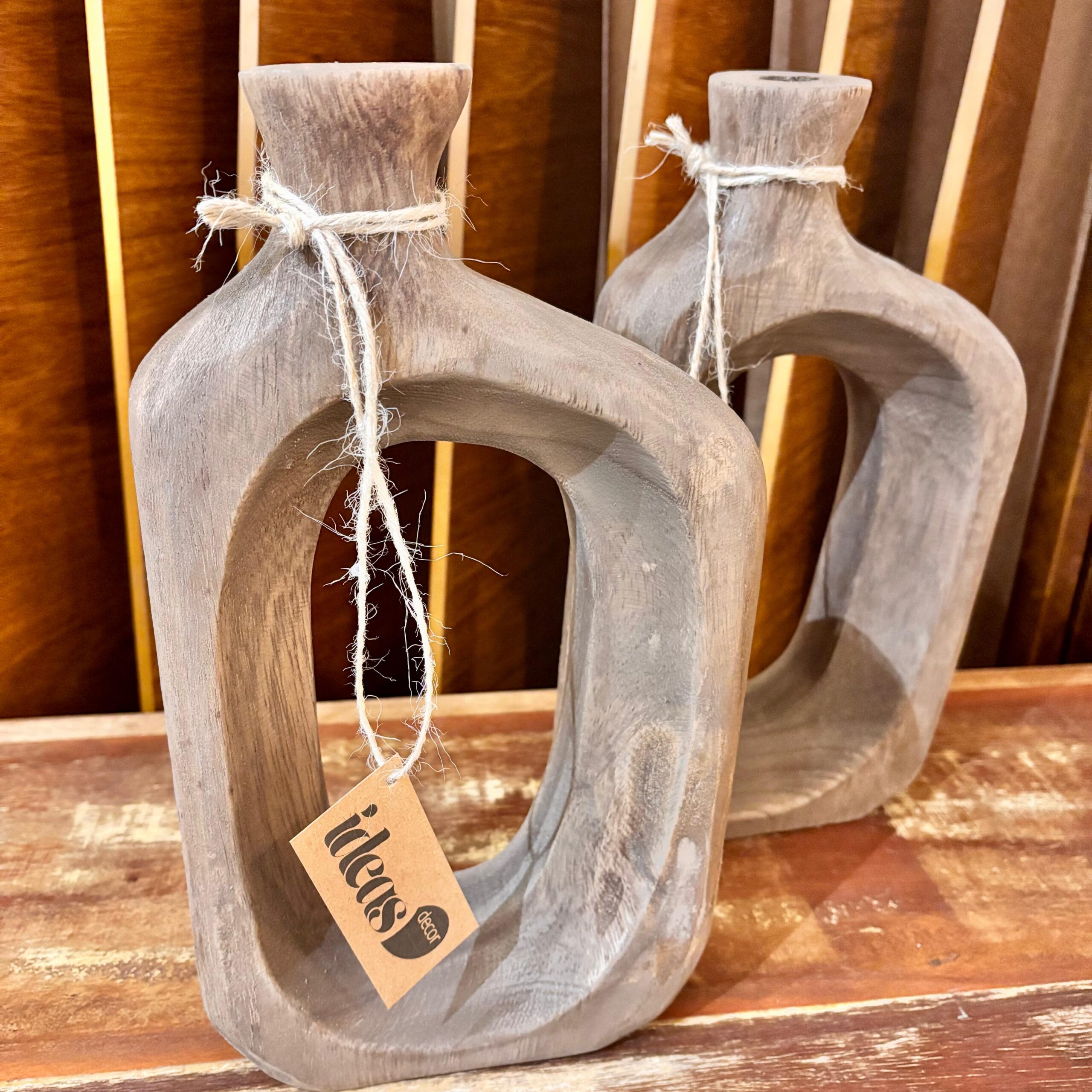 Textura natural e charme artesanal em formato slim. Talhado à mão em madeira rústica, este vaso é perfeito para destacar aparadores, estantes e mesas laterais — funciona com ramos secos/folhagens ou solo como objeto escultural.