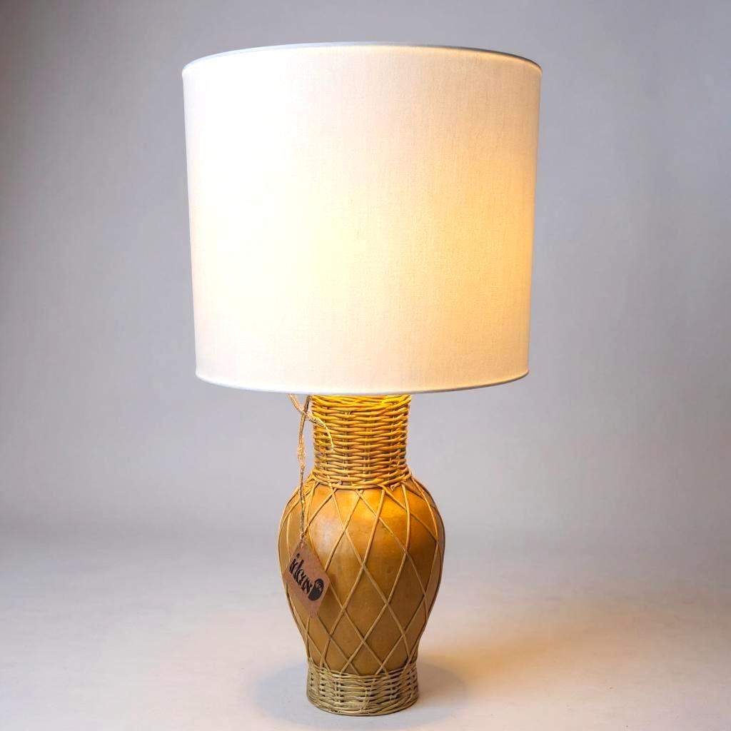 MATERIAL: Abajur produzido artesanalmente em argila queimada com detalhes em fibra de junco torcido e desidratado. Na parte de cima do abajur é feito a finalização dos detalhes com madeira marupá.