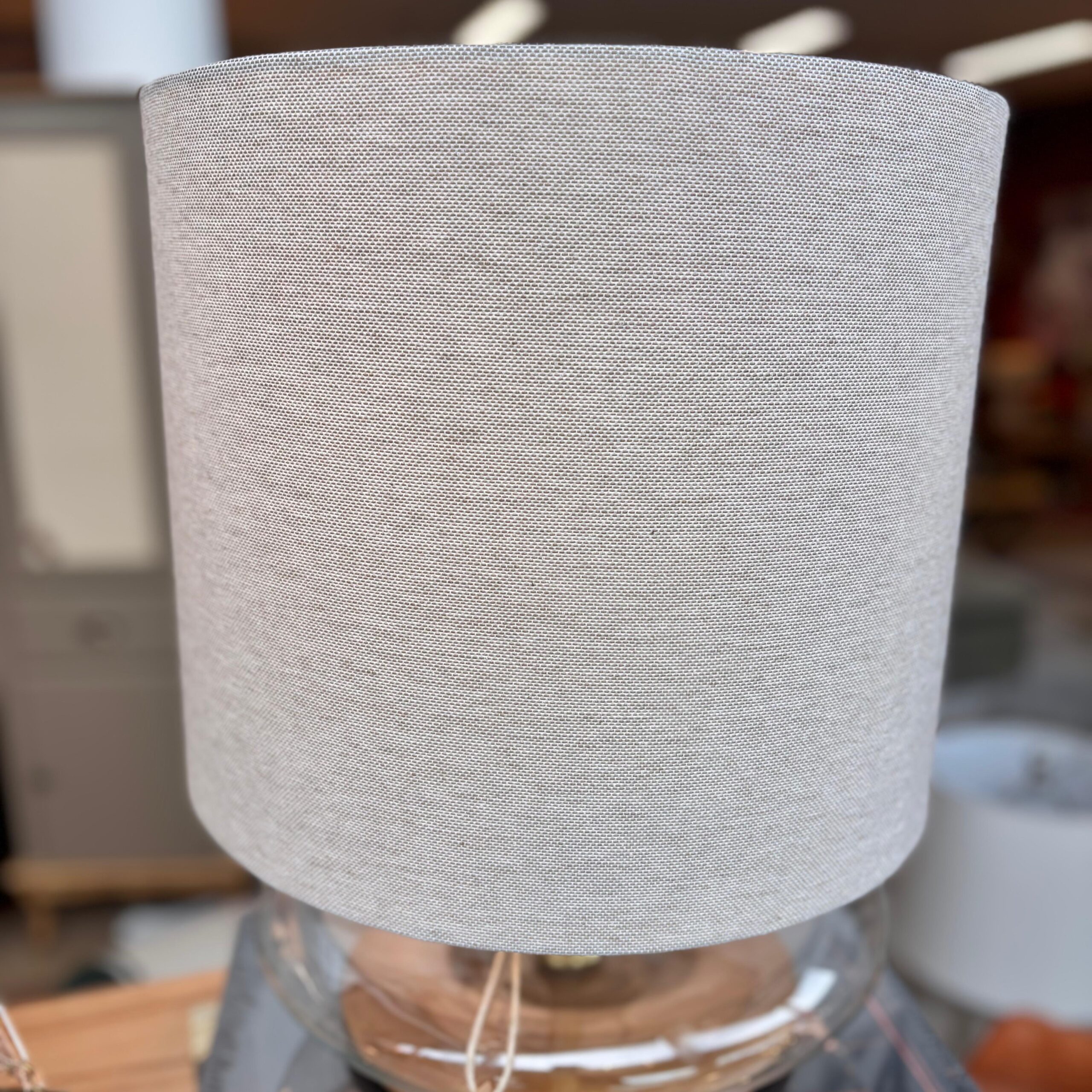 Sofisticação leve para o seu décor. A base em madeira com cúpula de vidro transparente e cúpula em linho cria uma iluminação difusa e acolhedora — perfeita para mesas laterais, criados e aparadores no estilo contemporâneo/coastal.