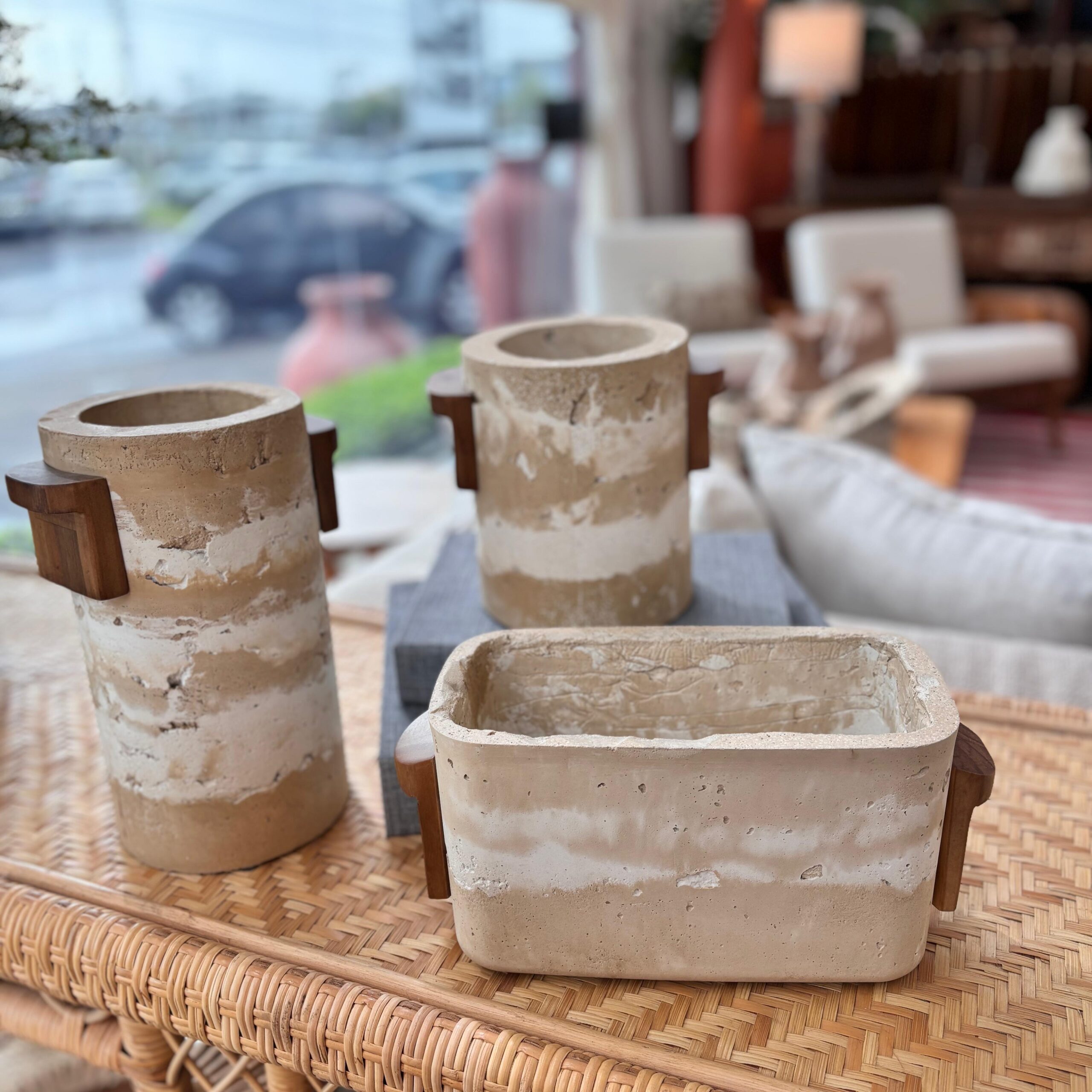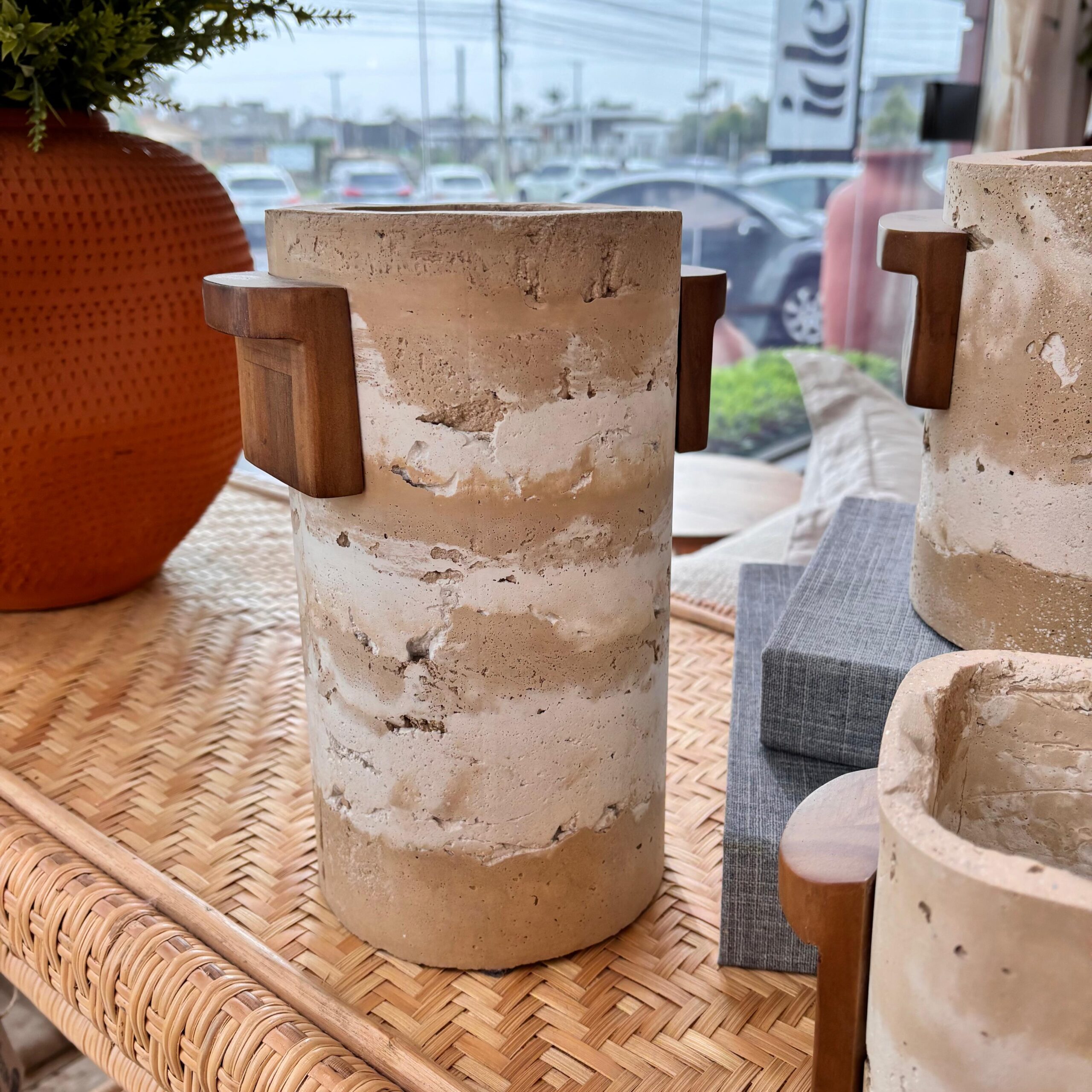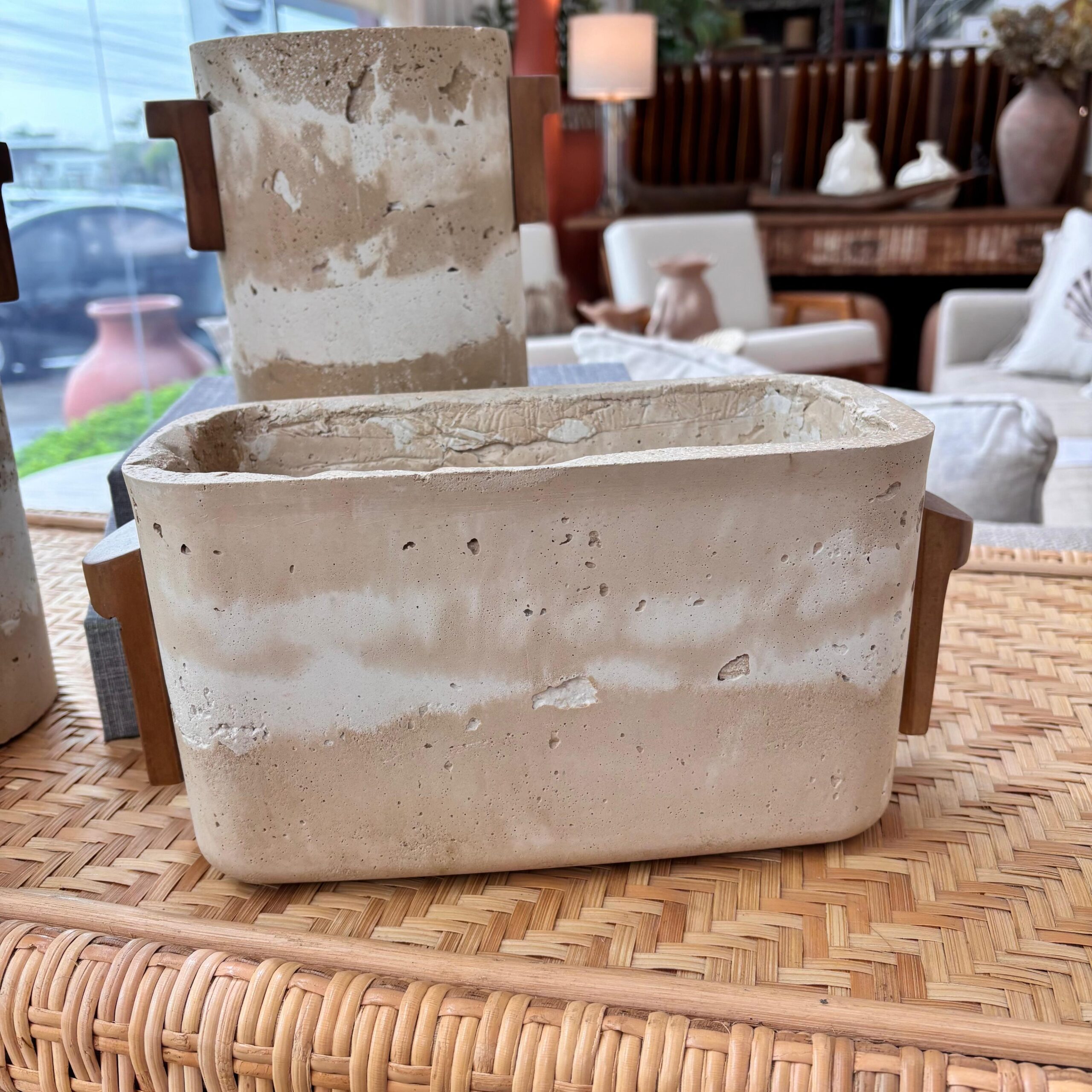 Design clean com textura natural. O corpo em cimento contrasta com detalhes em madeira, criando um cachepô de fino acabamento que funciona com suculentas, ramos secos/verde ou solo como objeto escultural. Perfeito para aparadores, mesas de centro e bancadas.