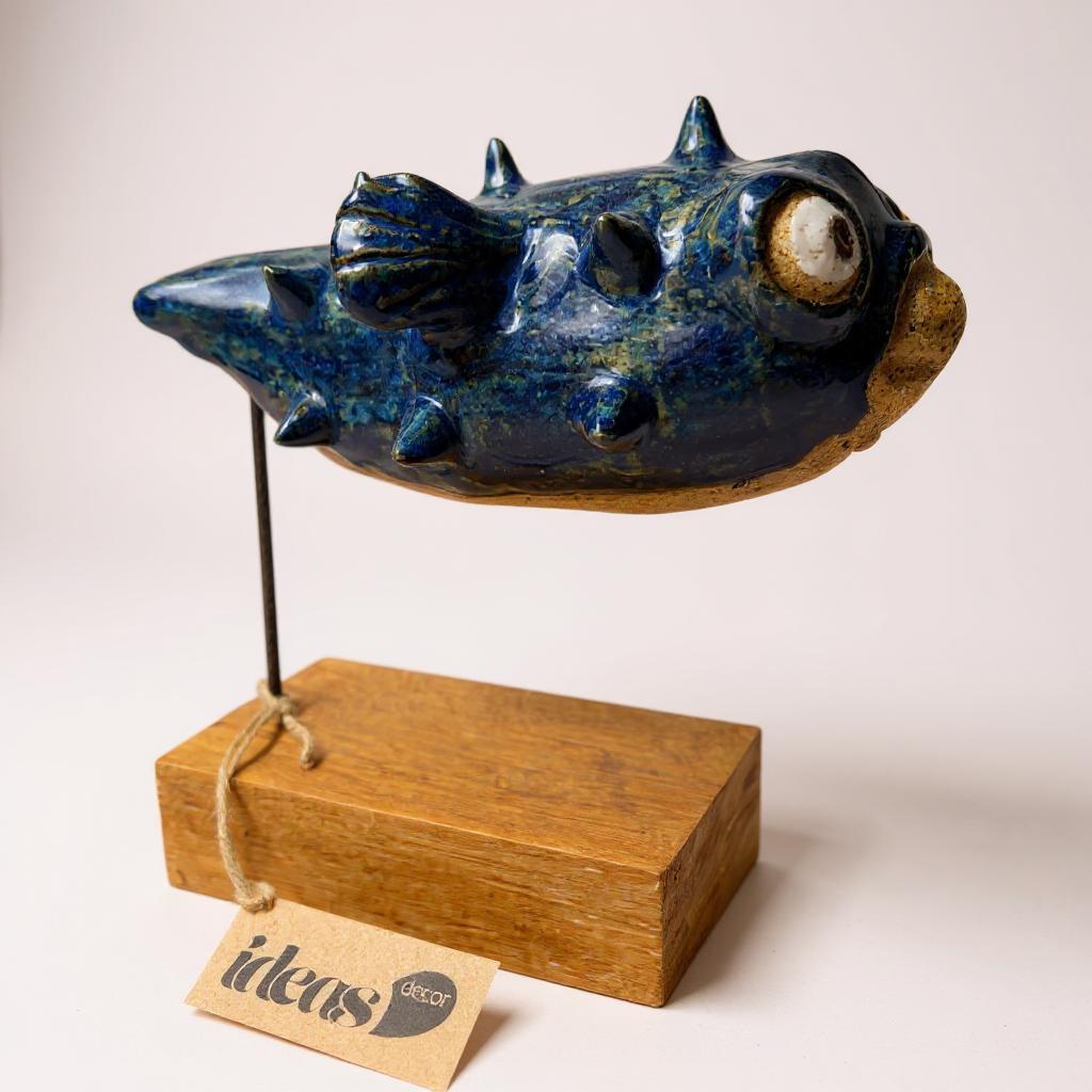 Escultura do peixe baiacu produzida artesanalmente em cerâmica e madeira, com acabamento delicado e autêntico. Com 22 cm de altura, 21 cm de largura e 9 cm de profundidade, na cor azul, é uma peça única que transmite personalidade e exclusividade. Ideal para compor a decoração de interiores sofisticados e atender ao olhar exigente de quem aprecia arte e design artesanal.