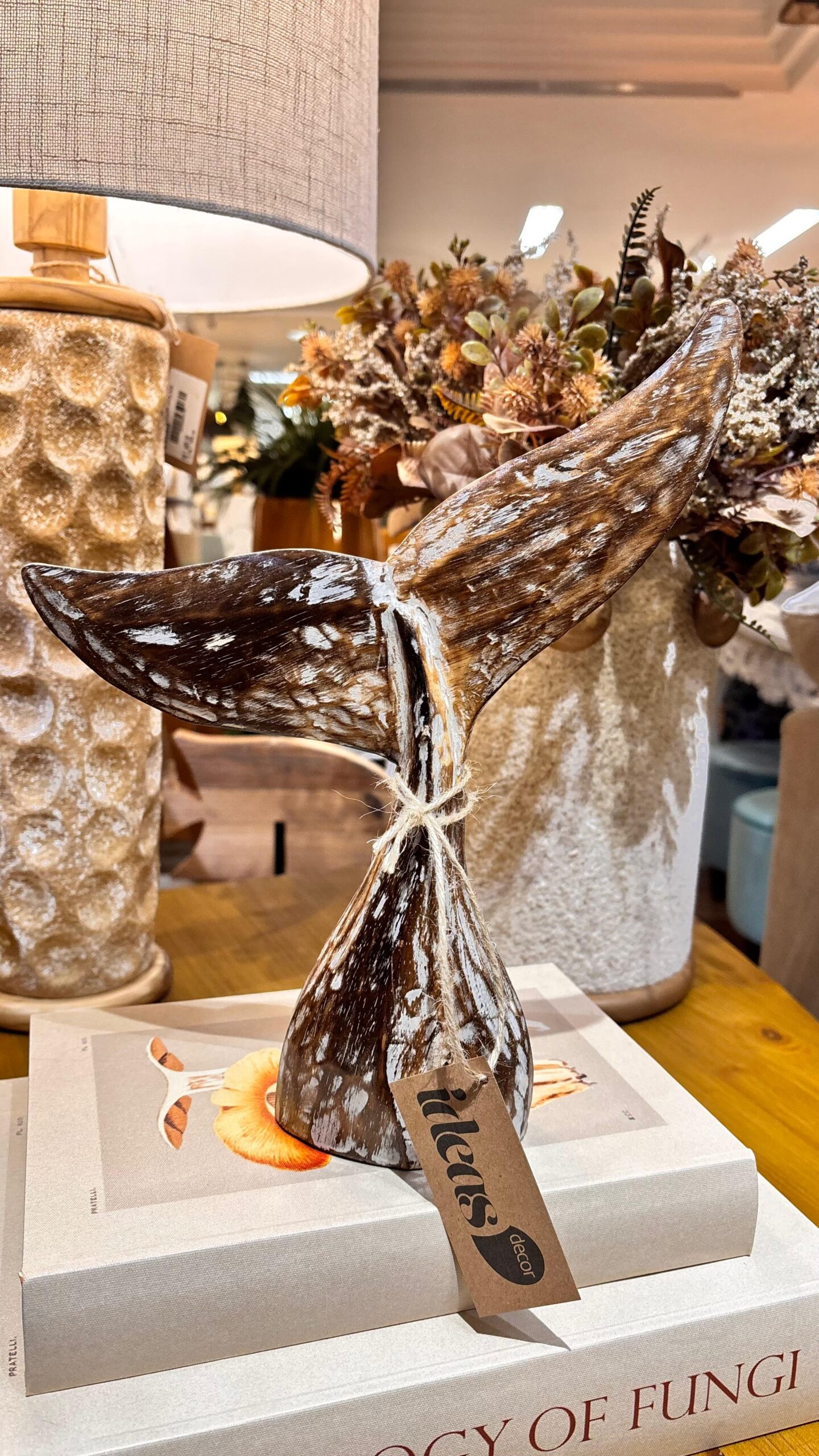 Símbolo do mar em versão artesanal. Talhada à mão em madeira rústica, esta escultura de rabo de baleia leva textura orgânica e presença elegante ao décor coastal-chic — perfeita para aparadores, mesas laterais e estantes.