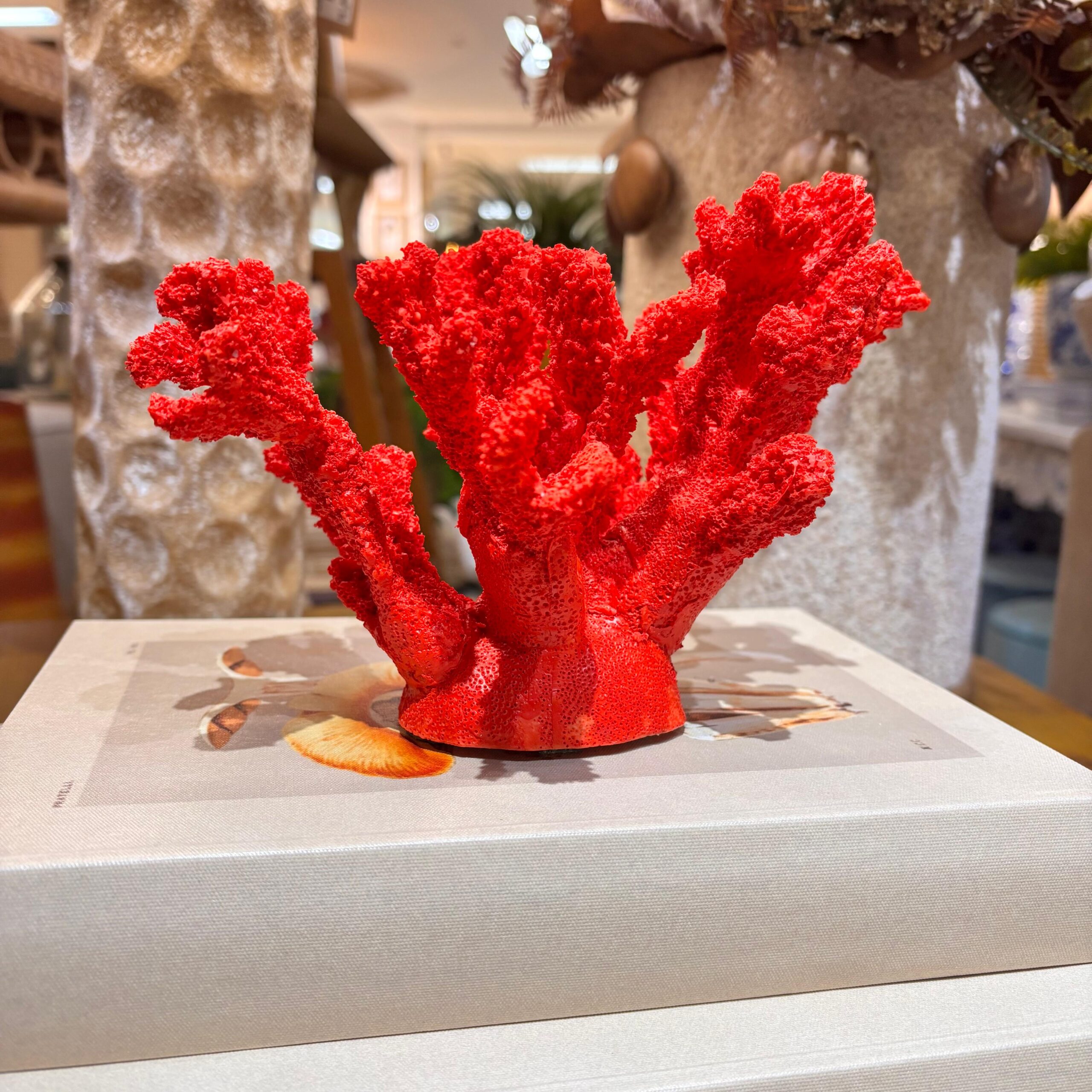 Um ponto de cor que valoriza o estilo coastal-chic. Em resina com textura realista, o coral vermelho ilumina composições sobre livros, bandejas e aparadores, trazendo leveza e personalidade ao ambiente.
