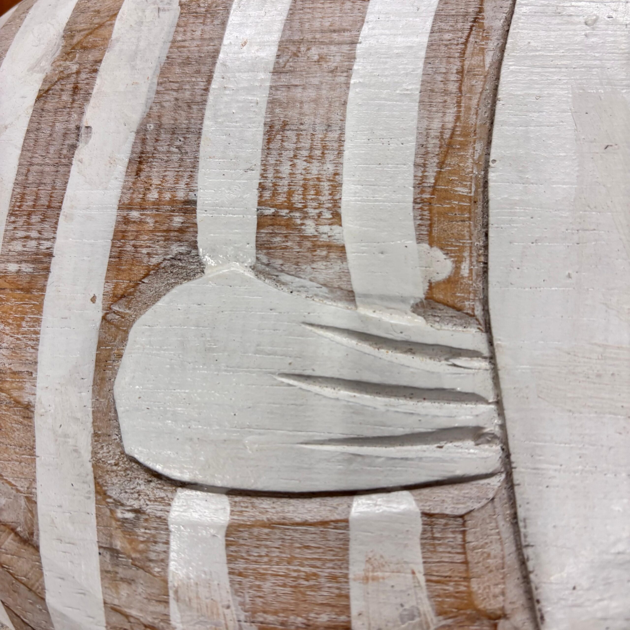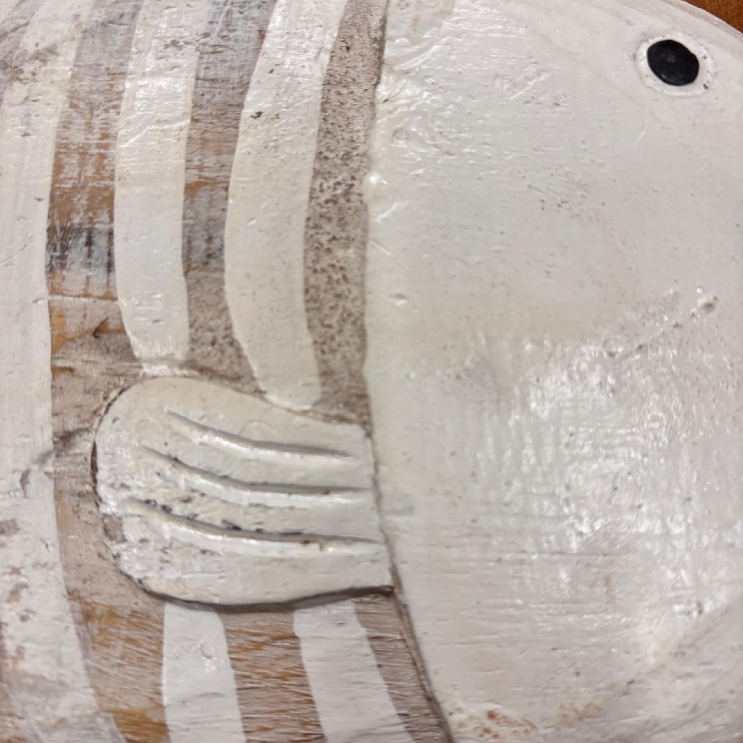 Textura natural e charme coastal-chic para destacar suas paredes. Conjunto com três peixes talhados 100% à mão em madeira rústica, acabamento em branco predominante e veios aparentes — perfeito para composições sobre sofás, aparadores e cabeceiras.